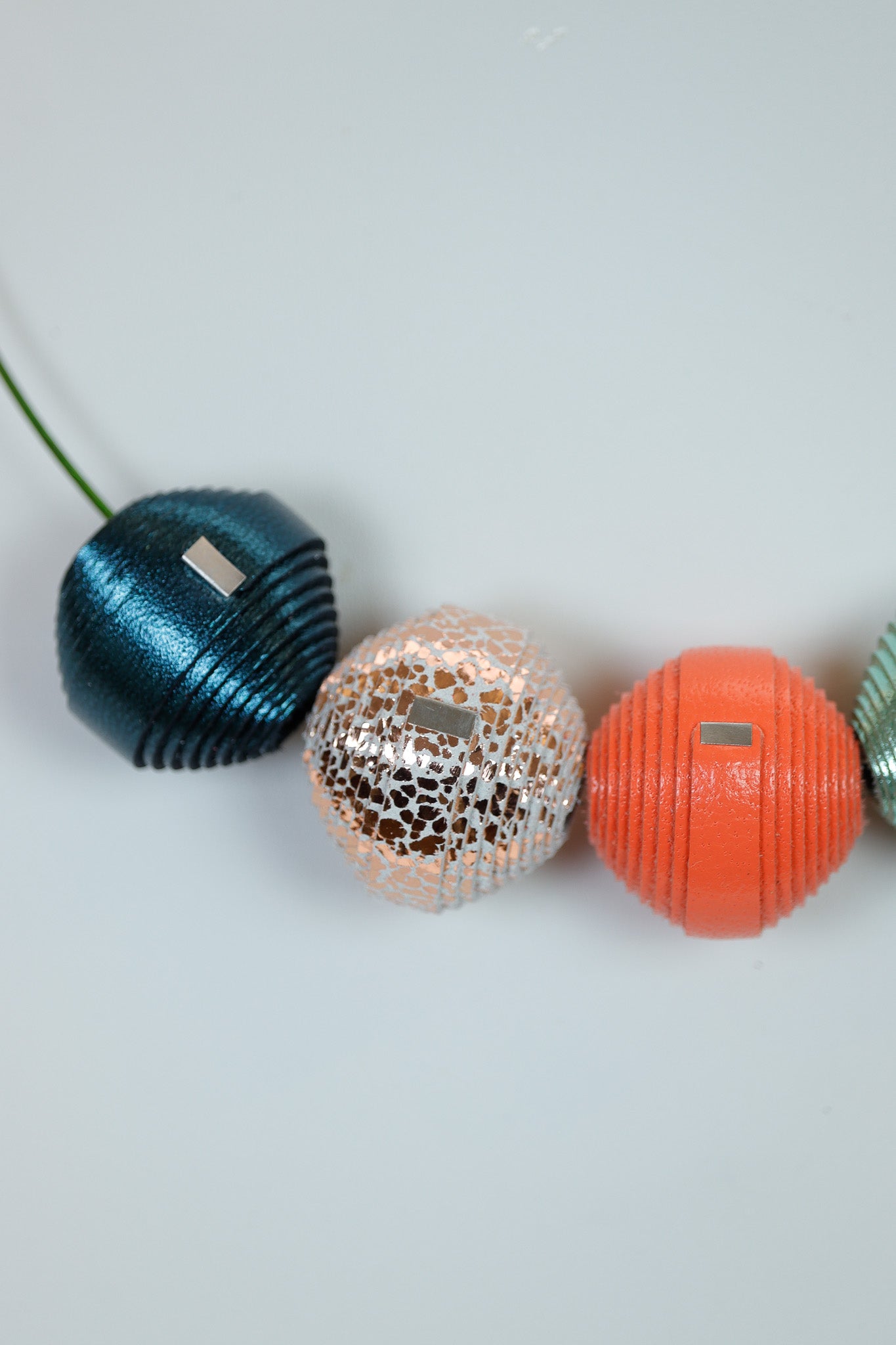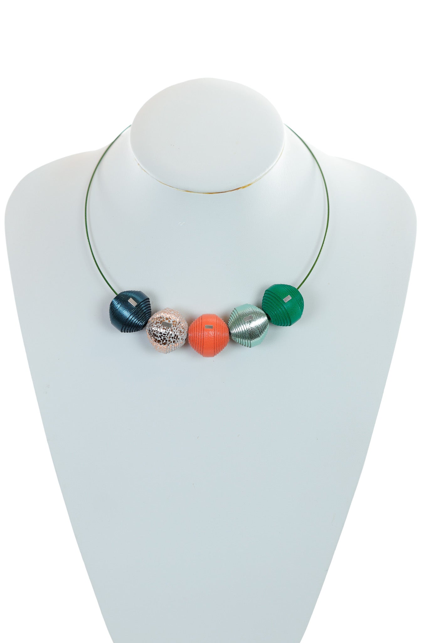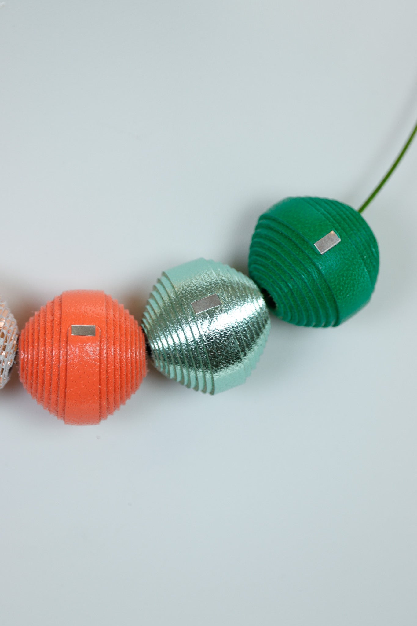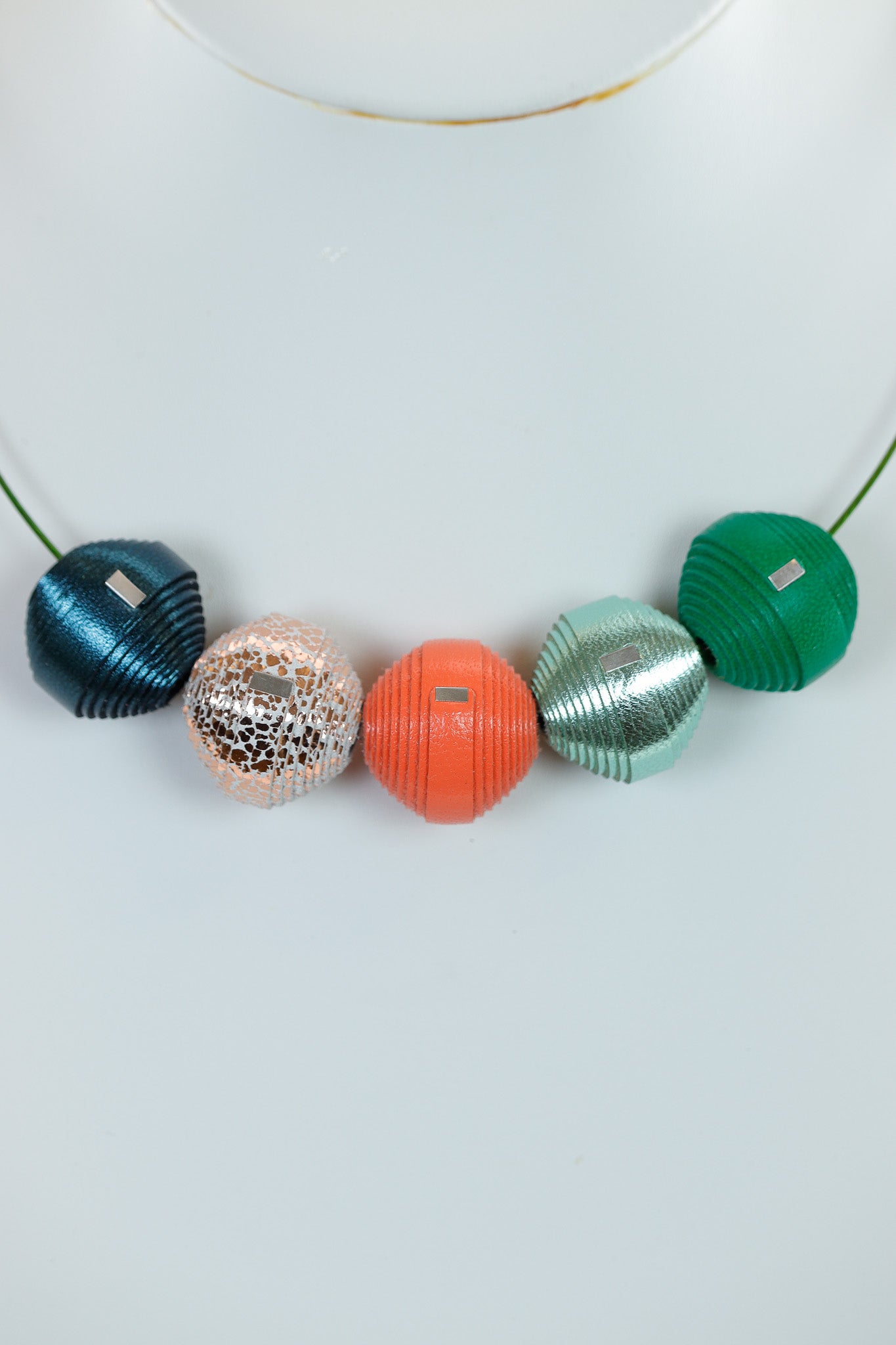 Acest colier este statement datorită efectului său wow! Bilele din piele naturală folosesc nuanțe care aduc un mix festiv neașteptat: Verdele și Albastrul aduc prospețime, iar Portocaliul și bila Argintiu-Crăpată adaugă căldură și sparkle.