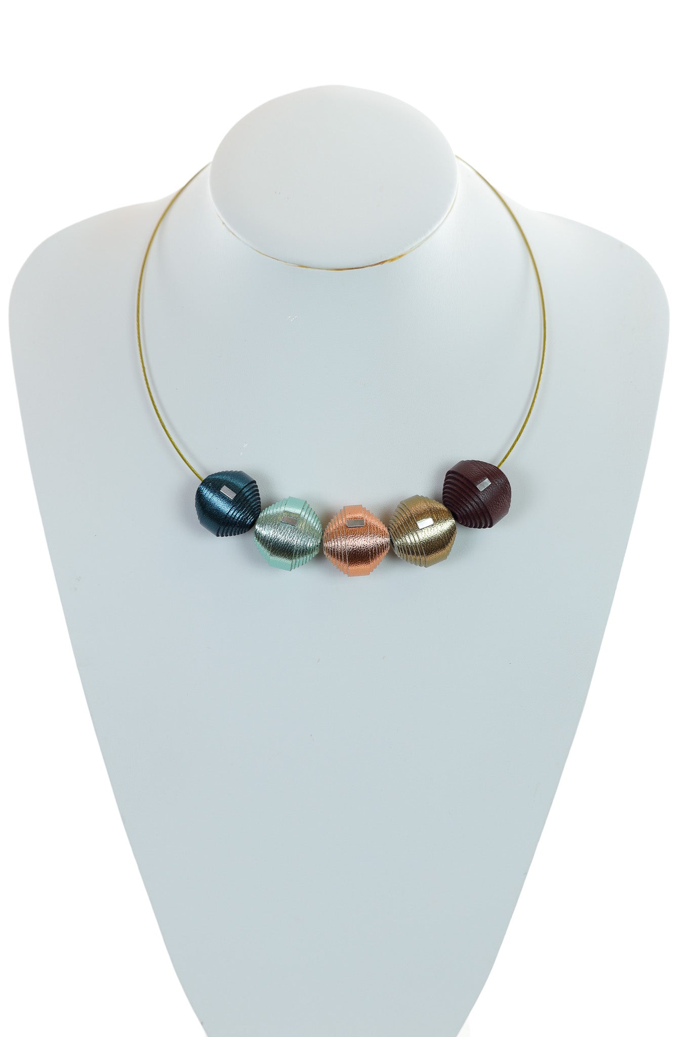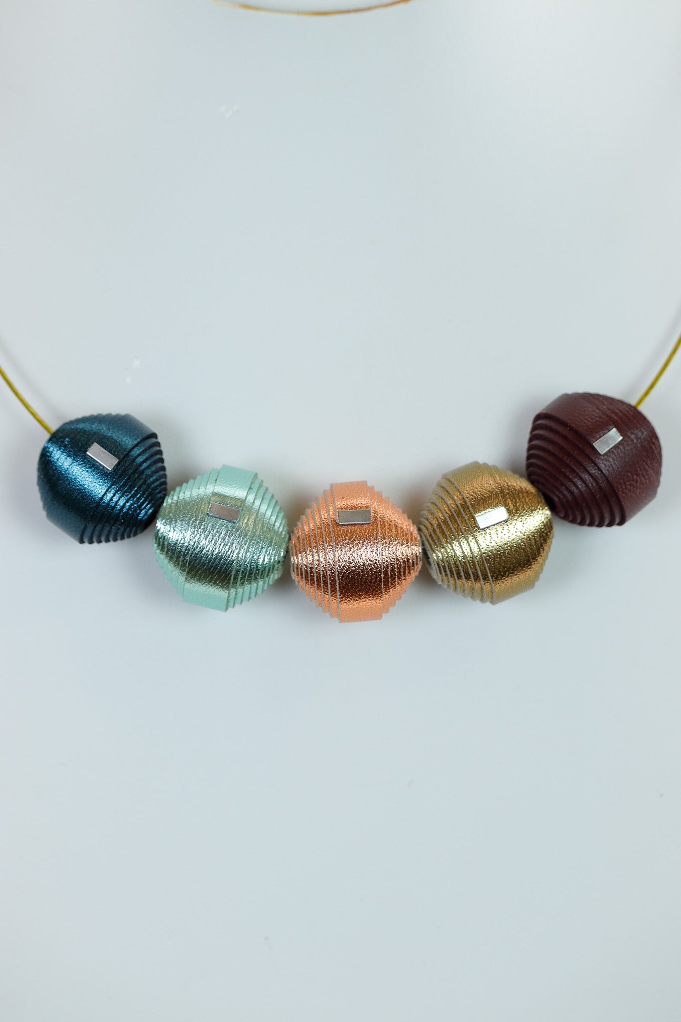 Acest colier este statement datorită modului în care îmbină elemente opuse! Bilele din piele naturală folosesc nuanțe care te duc cu gândul la un peisaj de iarnă: Albastrul și Verdele Mentă aduc vibe-ul de gheață, echilibrat de Cuprul și Maro Ciocolatiu cald, ca un lemn prețios.