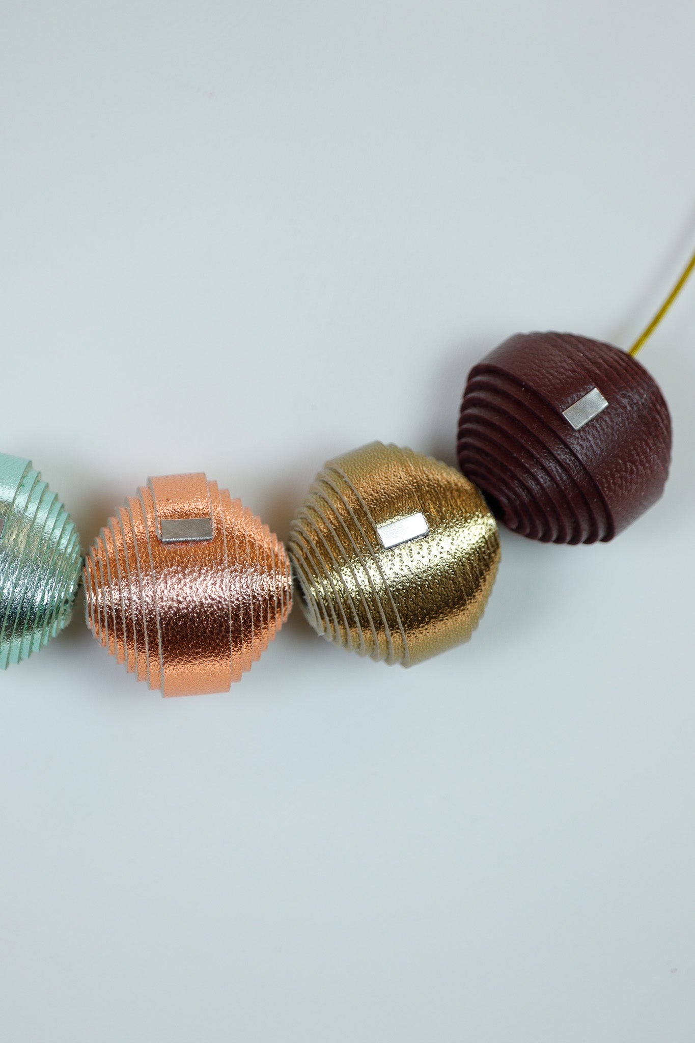 Vrei un look care să fie cozy și chic în același timp? Acest colier e piesa de bază perfectă! Bilele din piele combină tonurile pământii și reci, arătând ca niște ornamente moderne de iarnă.