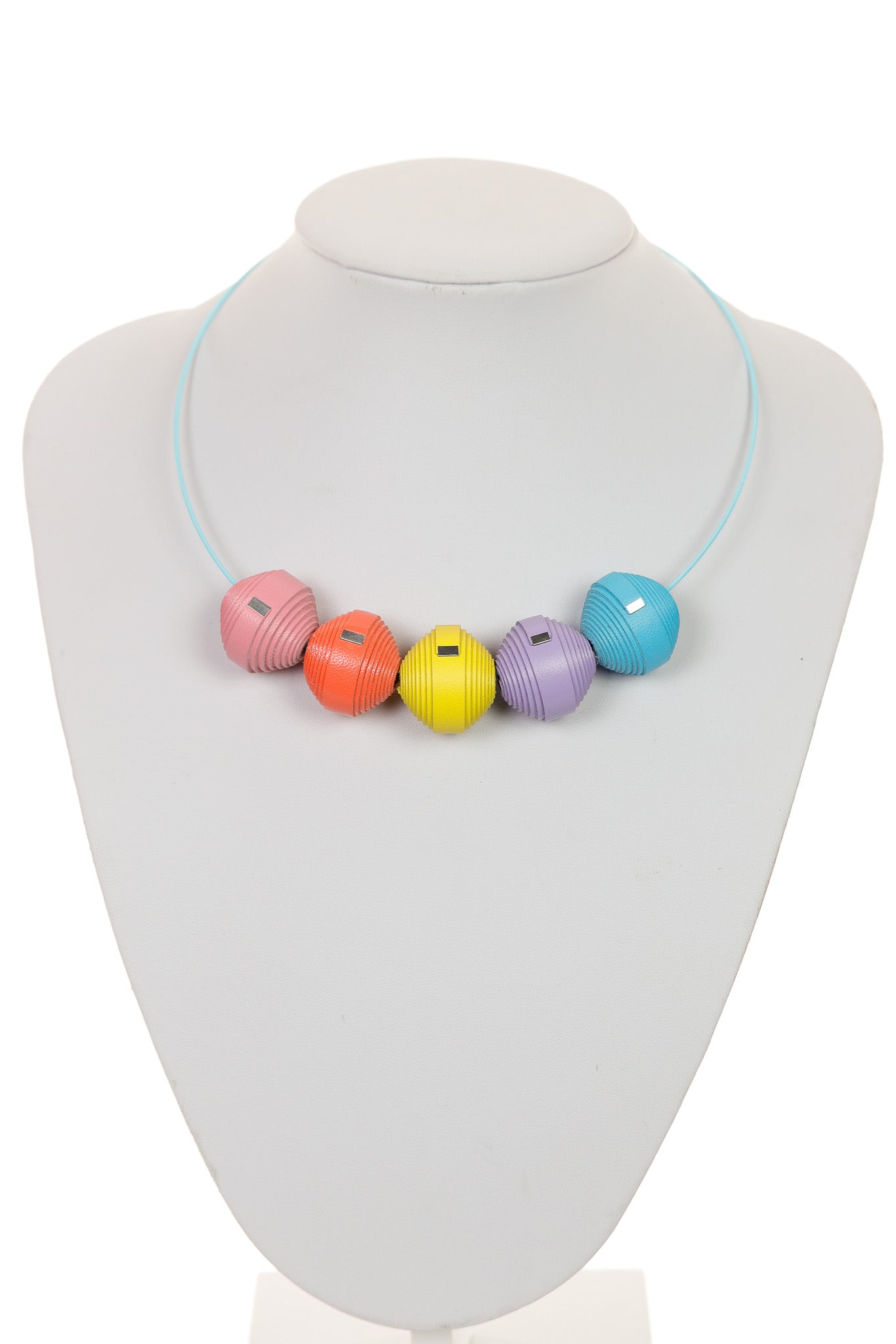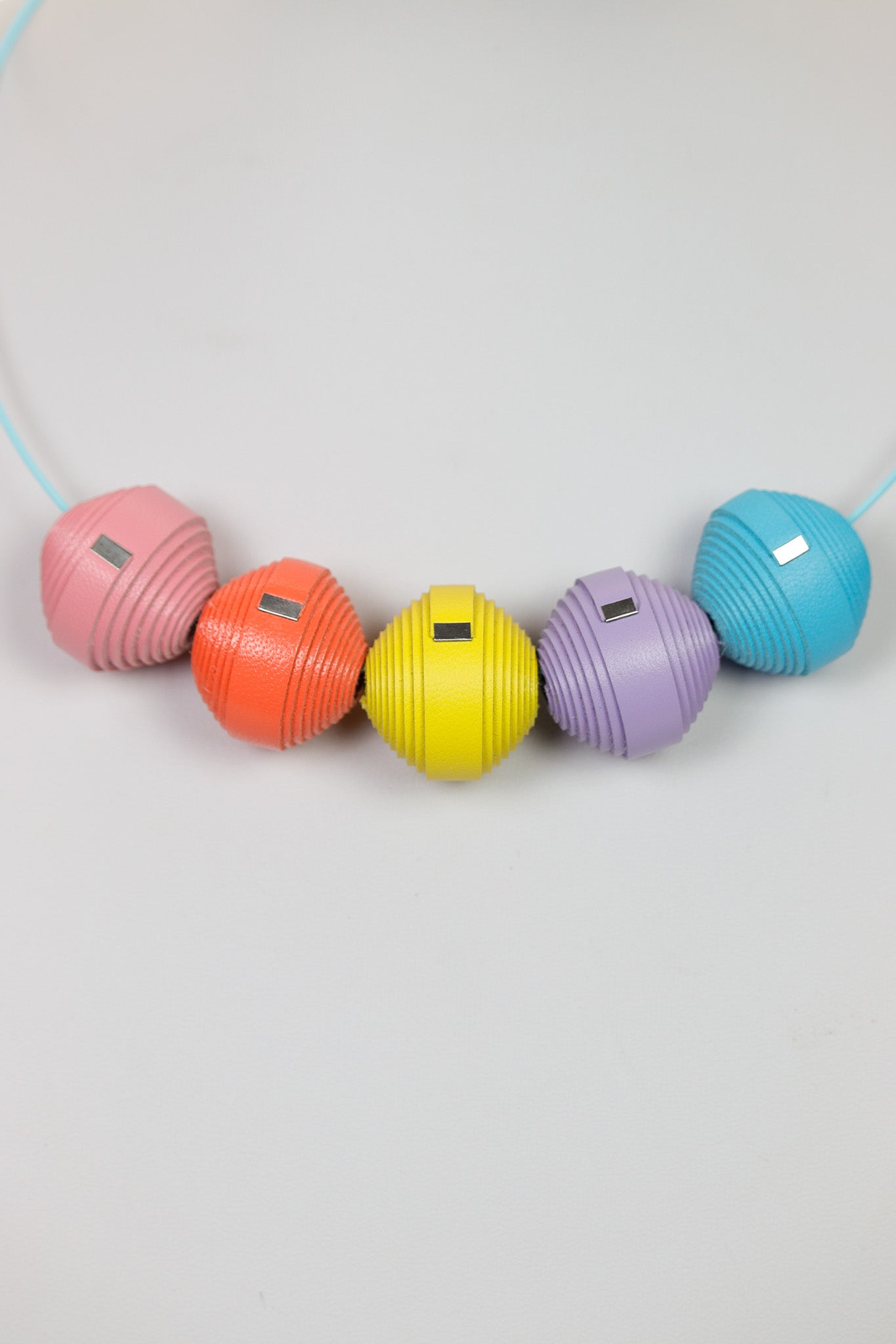 Colierul Leatherbonbon în nuanțe pastel de galben, roz, bleu și lila este piesa care îți aduce aminte de bucuria pură a zilelor de primăvară, oferindu-ți o stare de lejeritate și optimism imediat ce îl porți. Te face să te simți feminină, veselă și plină de viață, transformând orice moment al zilei într-o ocazie de a-ți exprima latura creativă. Cele cinci bonbon-uri delicate par să plutească pe o bază roz pal, oferindu-ți un sentiment de unicitate și o grație modernă.