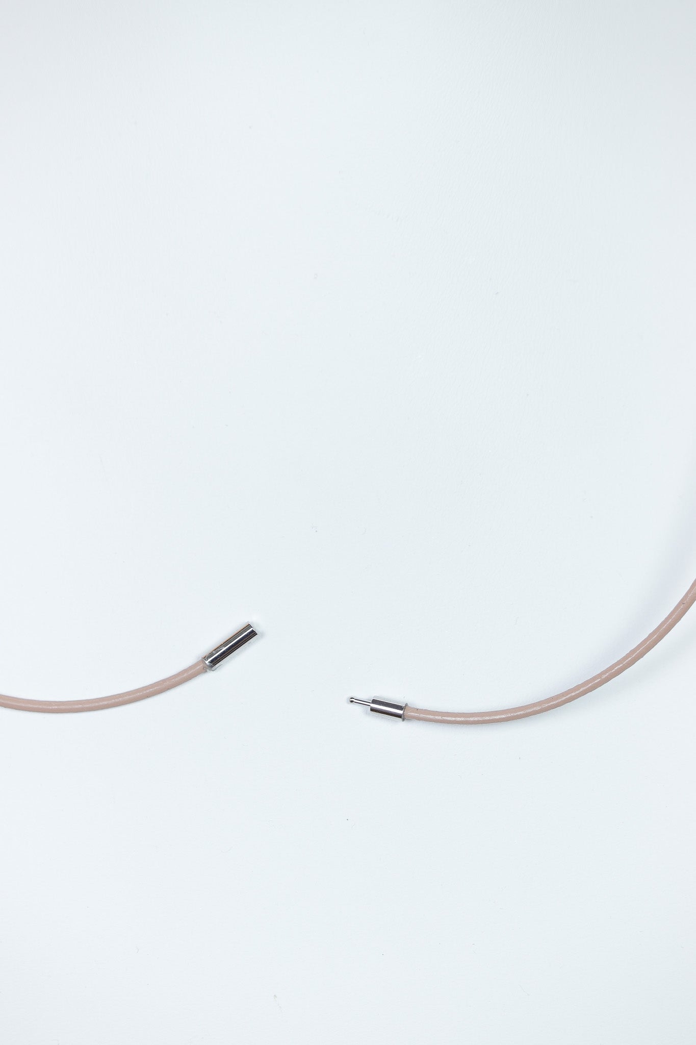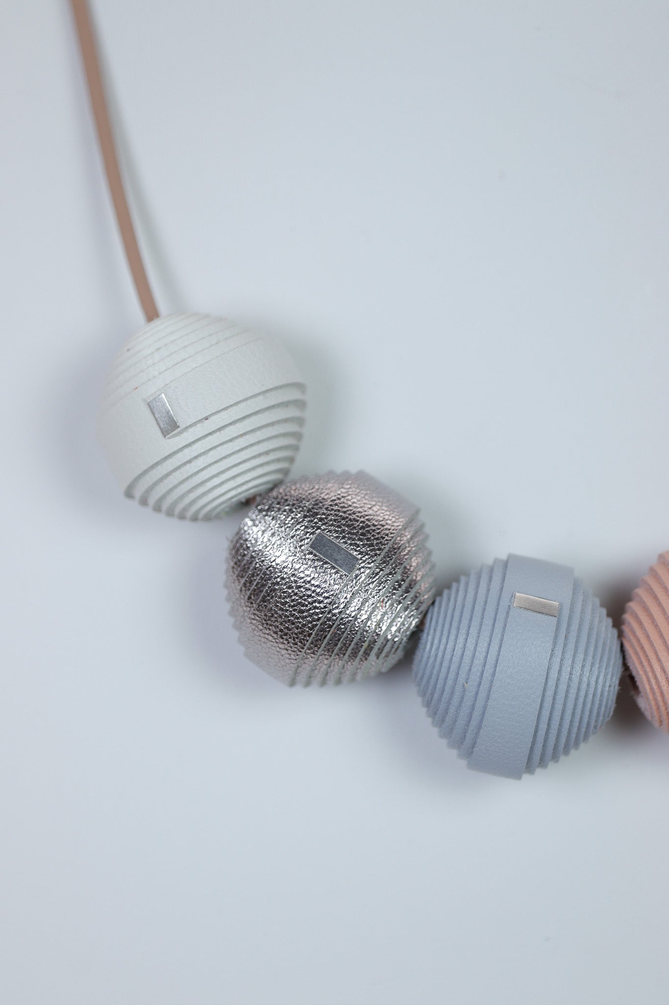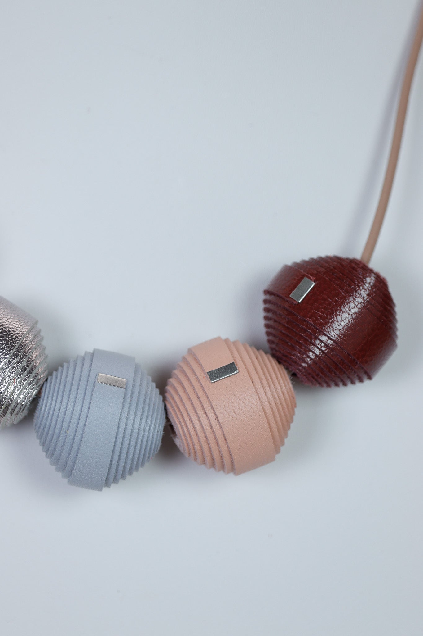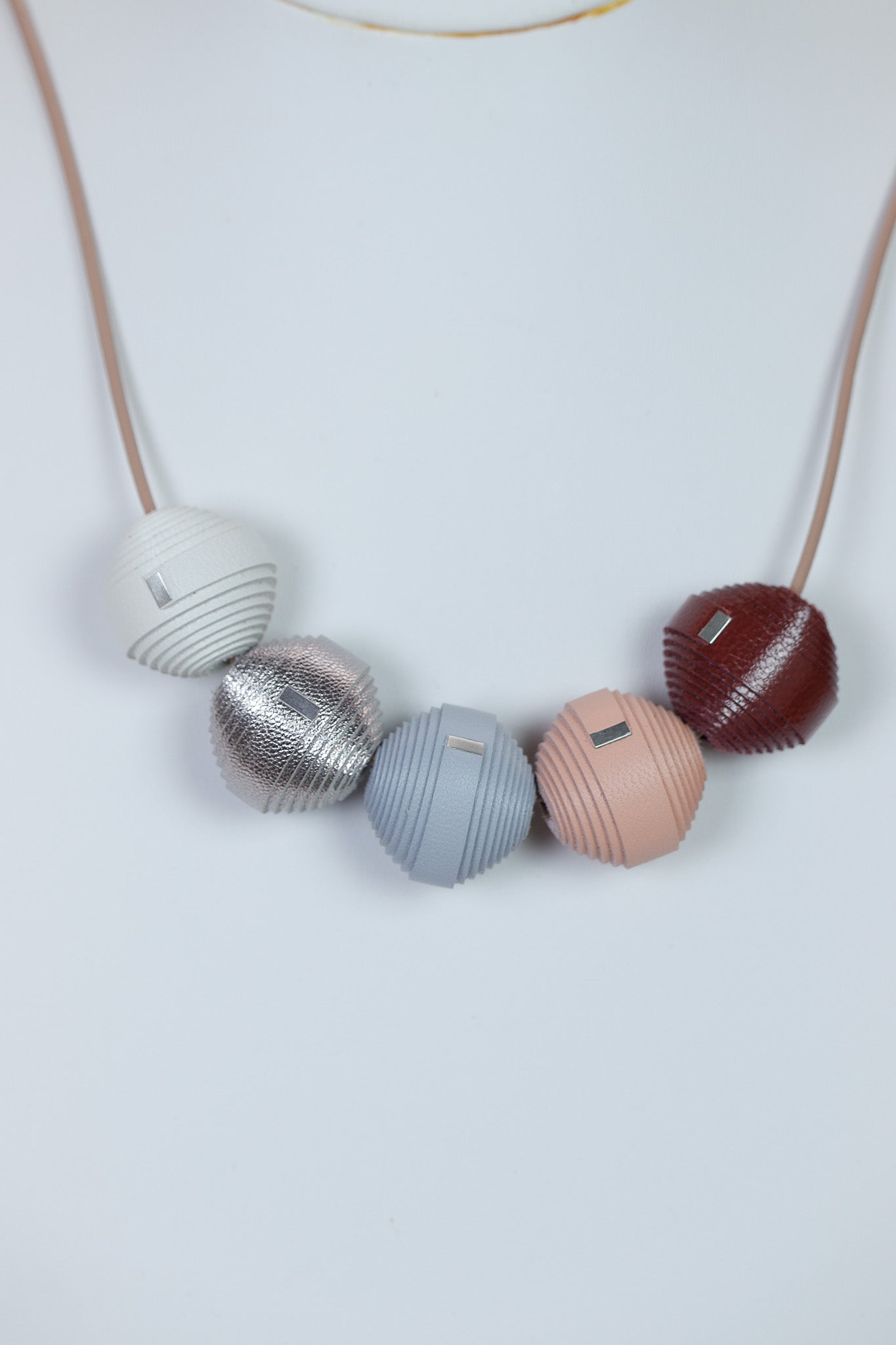 Acest colier este o piesă centrală a oricărei ținute, ideală pentru a te simți încrezătoare și stilată, oferindu-ți posibilitatea de a-ți schimba look-ul în fiecare zi. Bilele "leatherbonbon" din piele naturală italiană, în nuanțe de la bordeaux și roz pudră la argintiu metalic și bleu-gri, sunt gândite pentru a fi purtate fie pe baza rigidă din sârmă siliconată (pentru un choker modern care se așează perfect la baza gâtului), fie pe șnurul lung din piele de 75 cm (pentru un look casual și relaxat). Flexibilitatea de a alege între cele două baze face din acest colier o bijuterie versatilă, perfectă pentru a completa orice outfit.