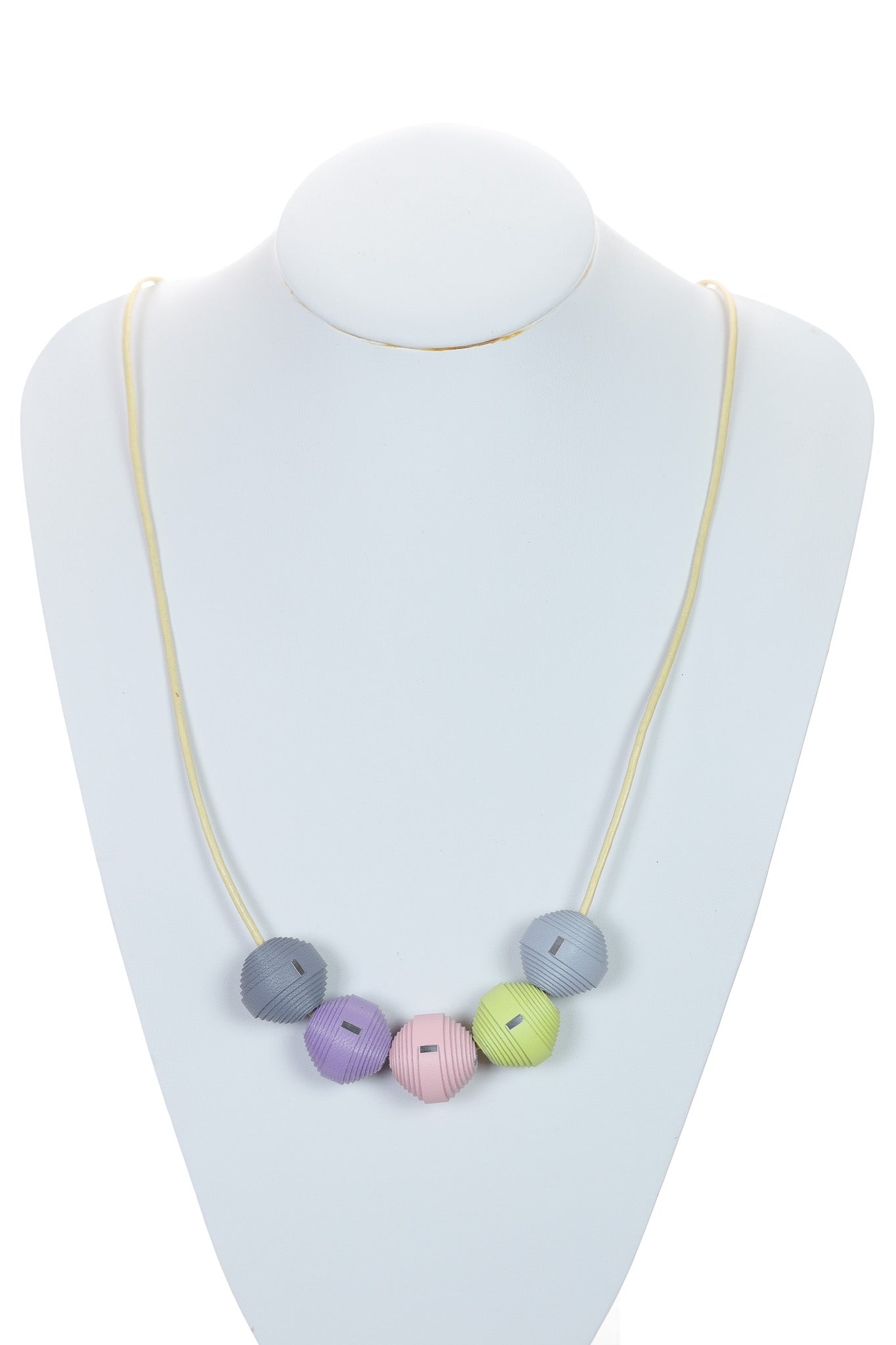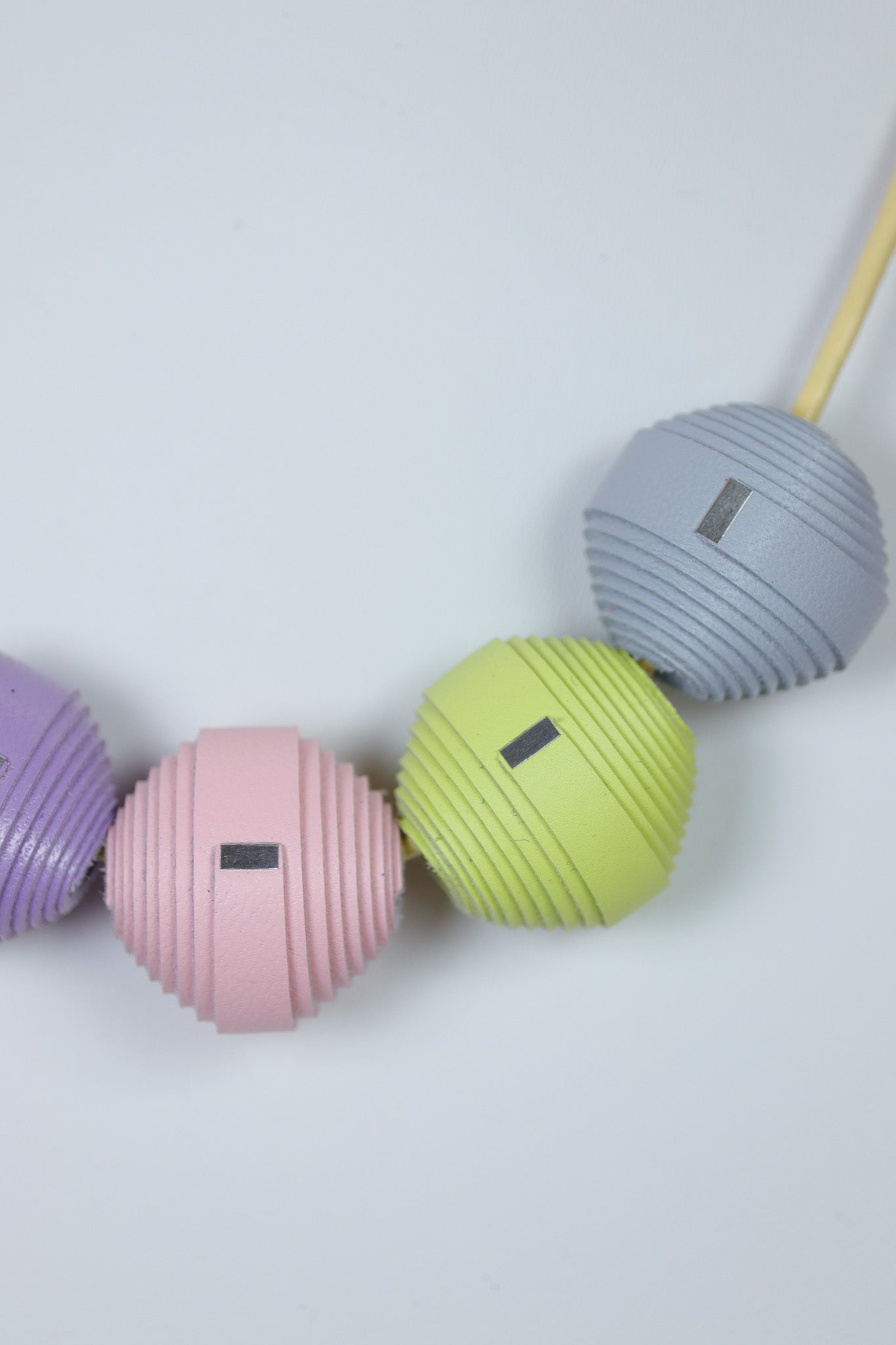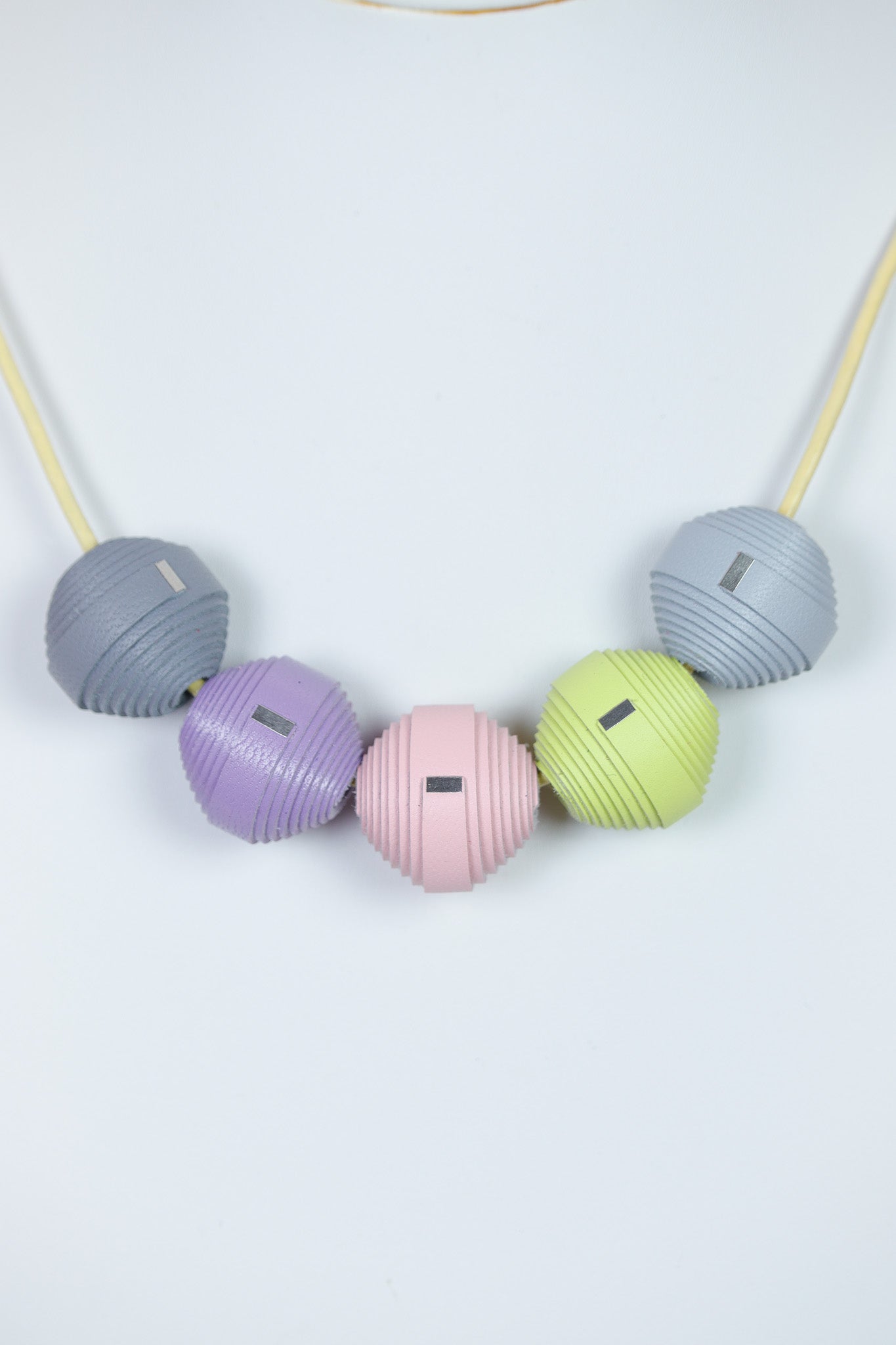 Un colier modern și sofisticat, realizat din bile unice de piele naturală, montate pe un șnur lung. Paleta de culori pastelate și finisajele mate transformă acest colier într-o bijuterie versatilă, perfectă pentru a adăuga un plus de stil și eleganță oricărei ținute.