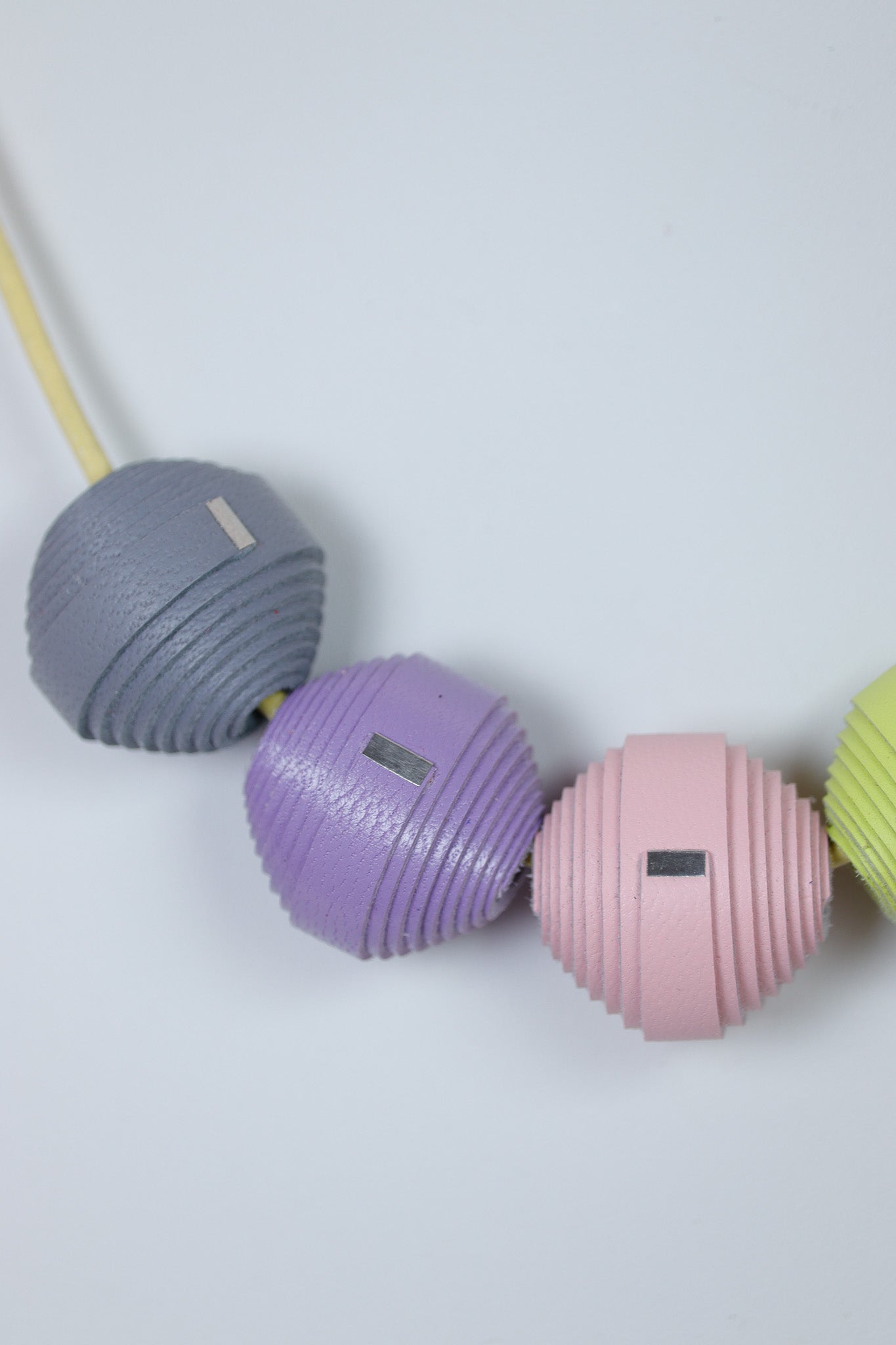 Acest colier este o piesă centrală a oricărei ținute, ideală pentru a te simți încrezătoare și stilată. Realizat din piele naturală italiană, colierul combină cu succes elemente sferice unice, în nuanțe delicate și moderne: gri-bleu, mov lavandă, roz pal și verde lime. Fiecare element "leatherbonbon", rulat cu atenție, adaugă o notă de originalitate și unicitate. Datorită șnurului lung de 75 cm, colierul se așează perfect, scoțând în evidență silueta și adăugând o notă de rafinament. Este o bijuterie versatilă, perfectă pentru a completa un outfit de zi cu zi sau pentru a-ți pune în valoare o ținută de seară, dându-ți o stare de bine și un touch de culoare subtilă.