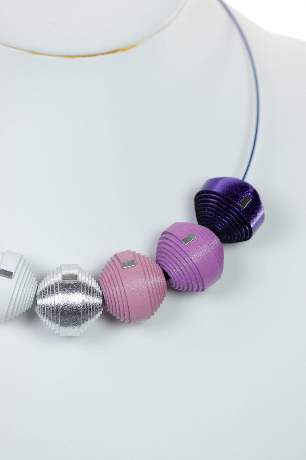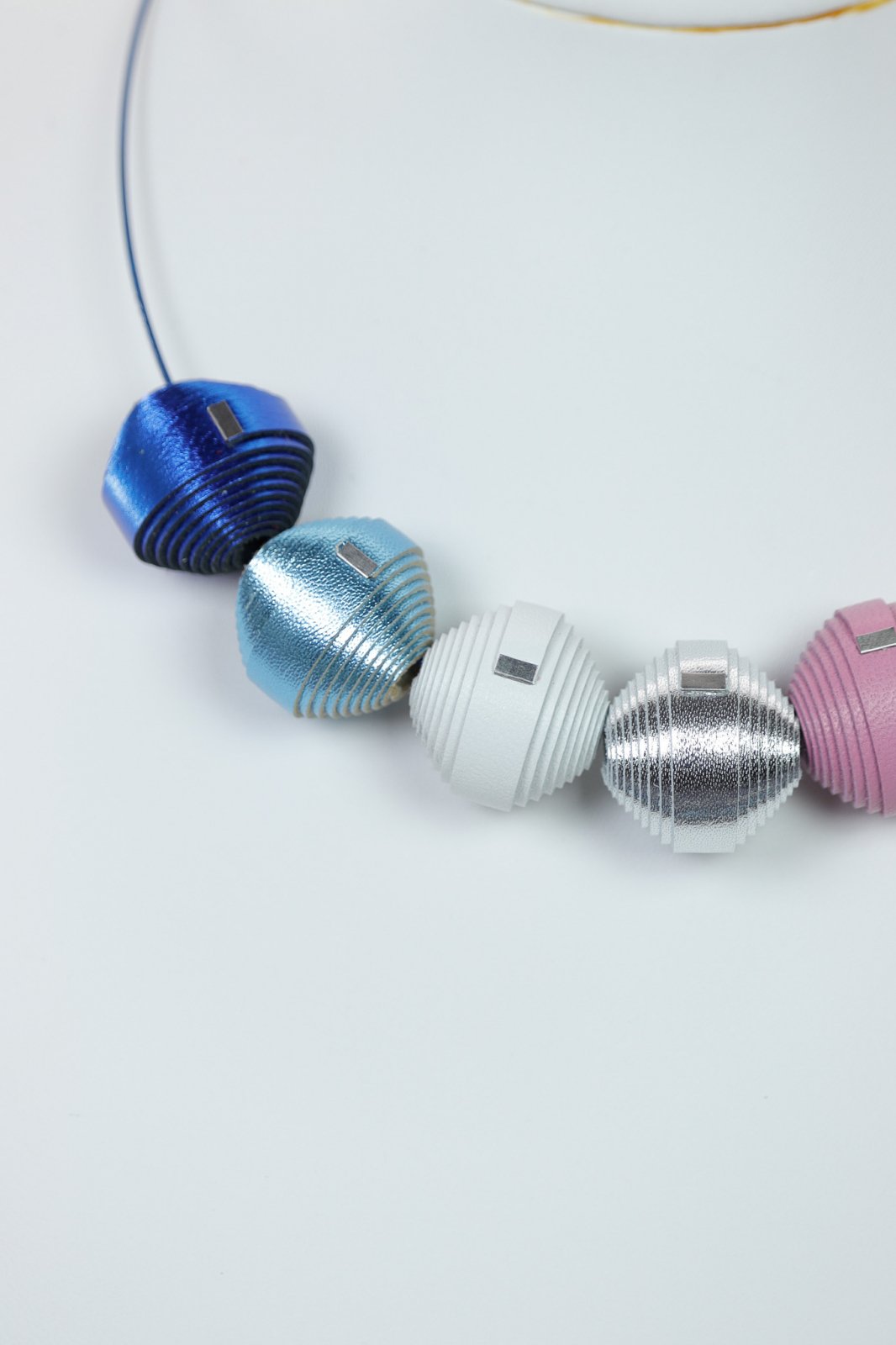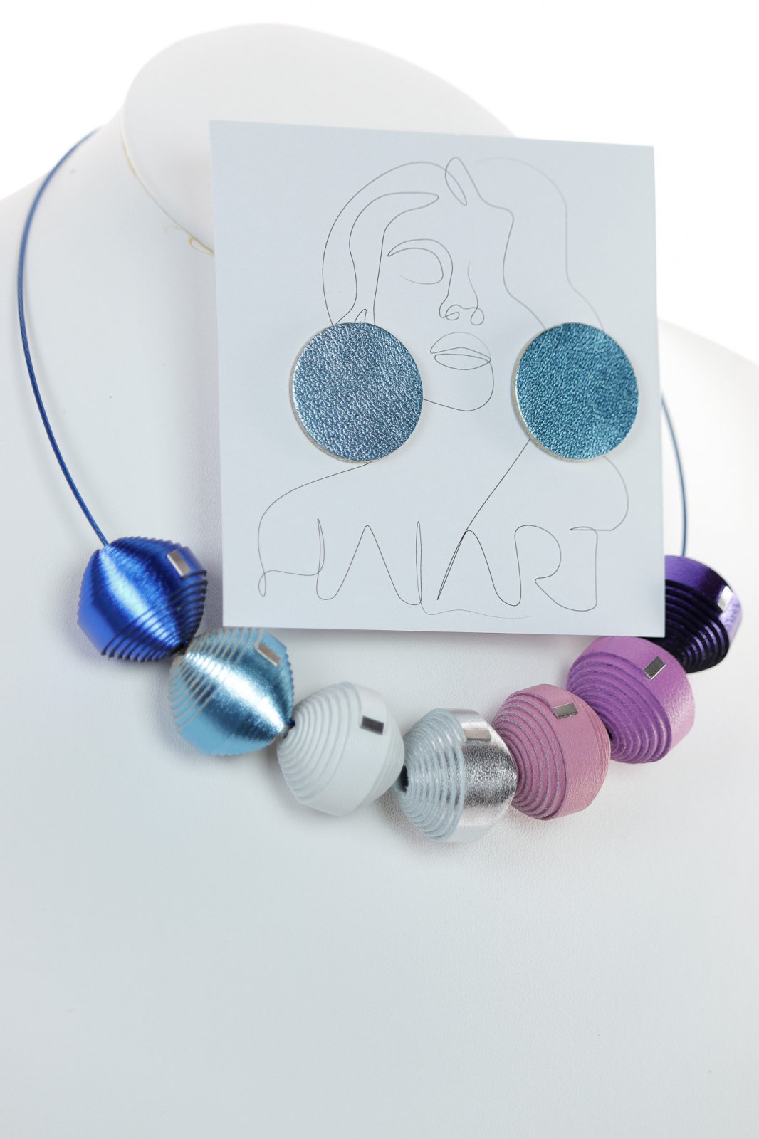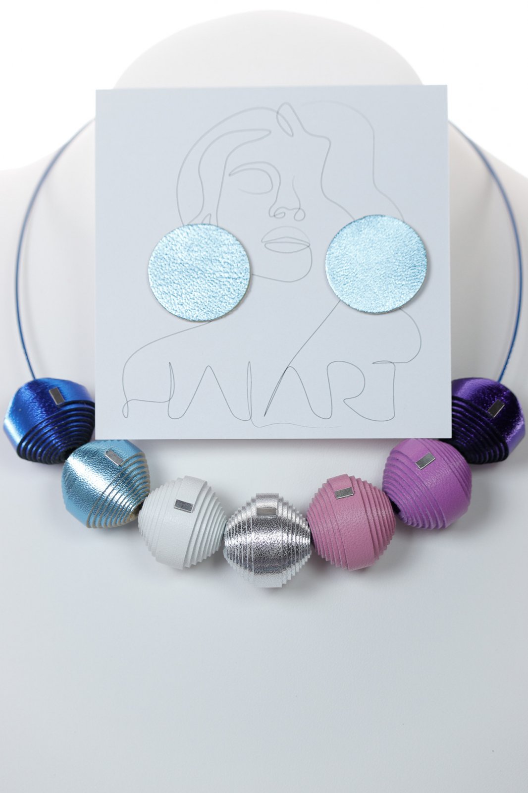 Acest Premium Box Leatherbonbon prezintă un concept inovator de bijuterii personalizabile, oferind 7 mărgele texturate din piele naturală în nuanțe metalice și vibrante - albastru metalic intens, violet metalic elegant, roz delicat, alb clasic, argintiu metalic lucios și albastru turcoaz, completate cu o pereche de cercei coordonați în nuanță albastru turcoaz. Fiecare element este lucrat manual cu atenție la detalii, creând texturi bogate și efecte vizuale captivante cu finisaje metalice sofisticate. Cutia include două baze de colier din sârmă învelită în silicon, permițând crearea a numeroase combinații și stiluri diferite. Conceptul îi permite purtătoarei să-și adapteze bijuteria în funcție de ținută, dispoziție sau ocazie, oferind versatilitate și creativitate maximă în stilizare, iar cerceii asortați completează perfect ansamblul.
