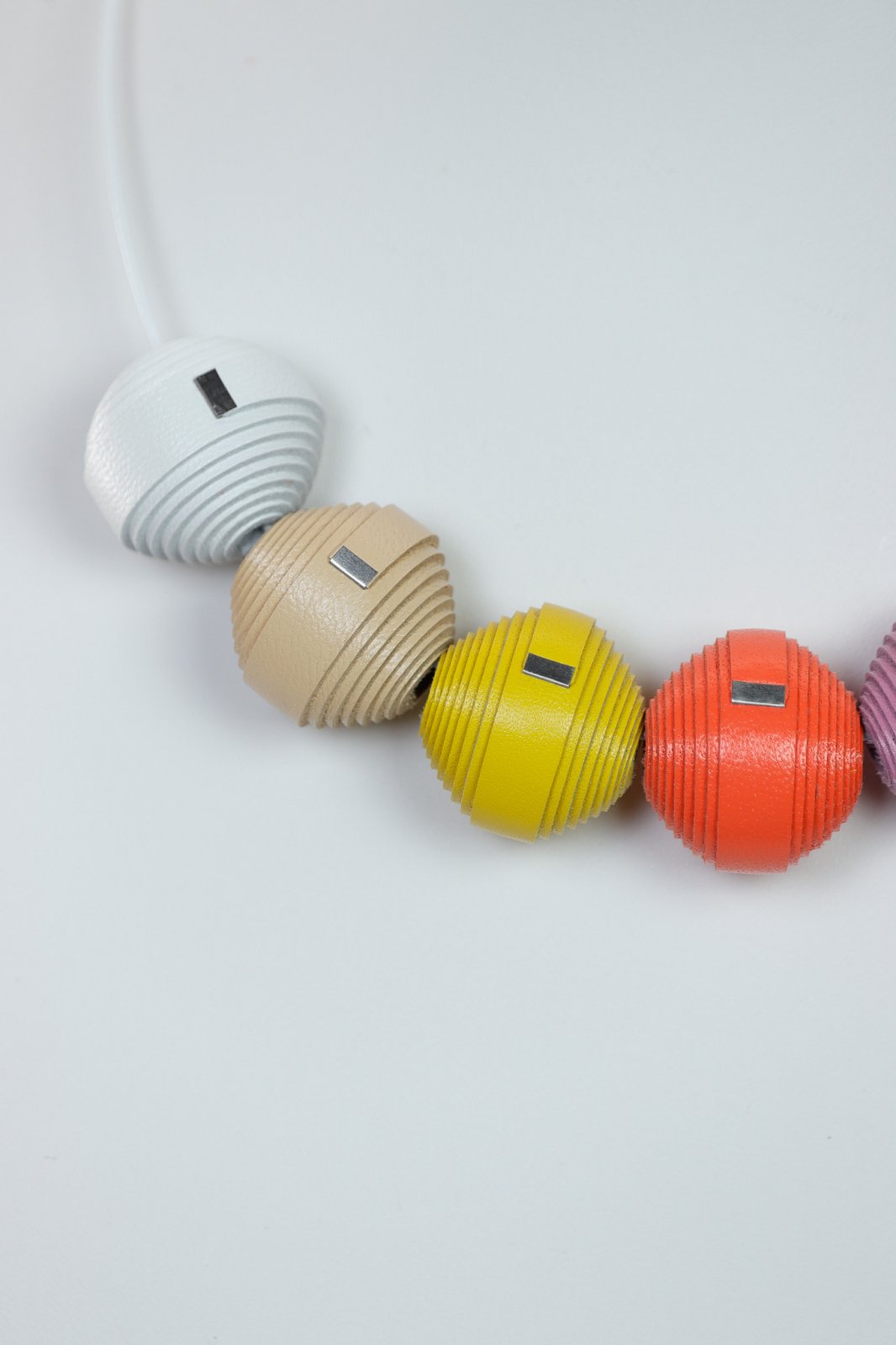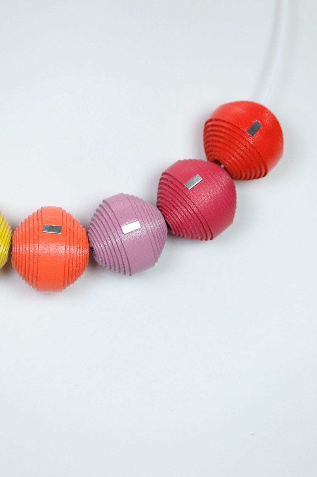 Premium Box Leatherbonbon - set personalizabil realizat din piele naturală cu mărgele texturate în nuanțe calde și vibrante. O cutie elegantă ce oferă posibilitatea de a crea multiple variații de colier prin combinarea elementelor incluse.