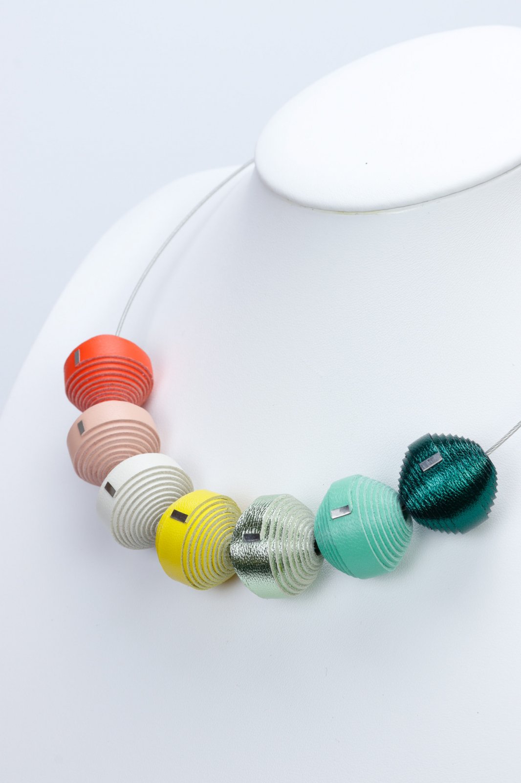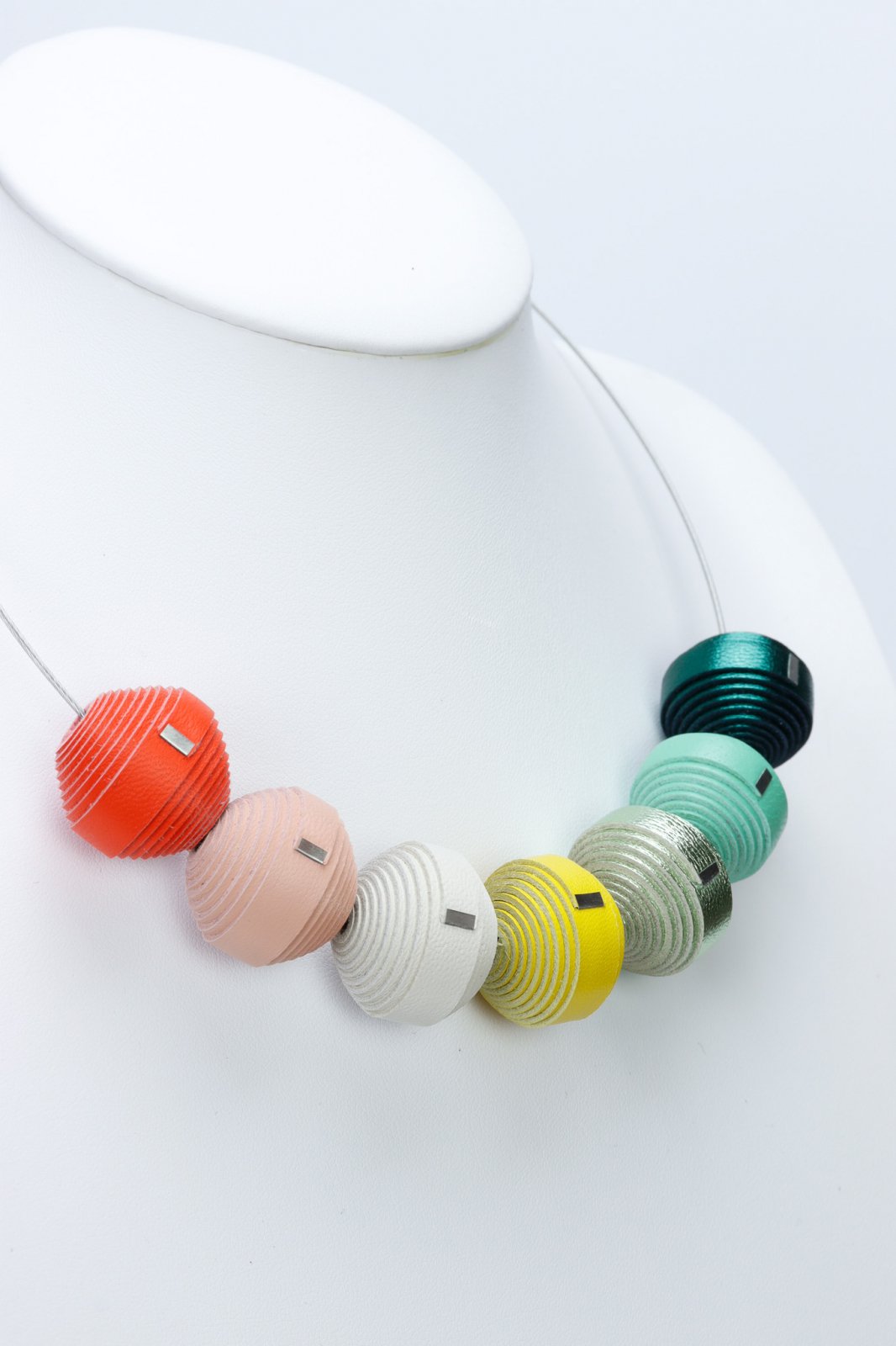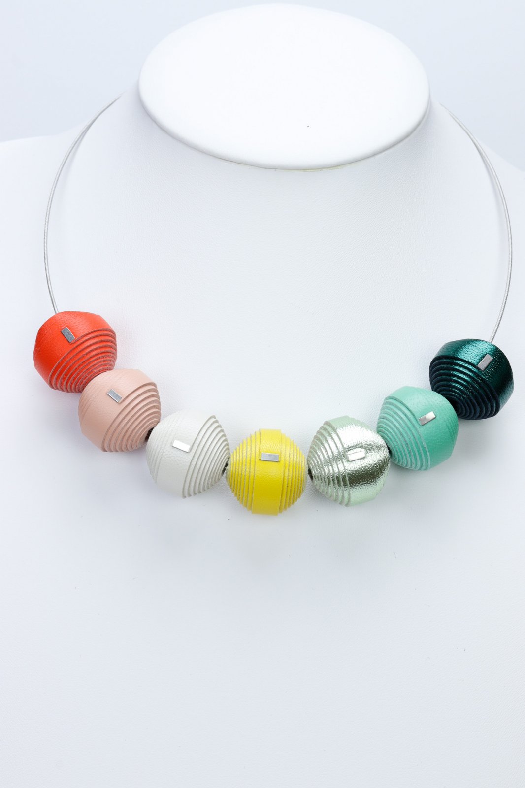 "Baza colierului este realizată din oțel inoxidabil auriu.Colier din piele lucrat manualConcept unic mix-and-match: bila metalică de la capătul bazei din oțel inoxidabil se deșurubează și poți adăuga bonboane de la alt colier, le poți scoate sau amesteca, astfel încât să poți avea un colier nou asortat oricărei ținute.Cutia premium conține 7 mărgele leatherbonbon care pot fi aranjate în combinații de la 3 la 7 mărgele, în funcție de dispoziție și stilul vestimentar.Diametru bază colier: aproximativ 14 cmConținut cutie: