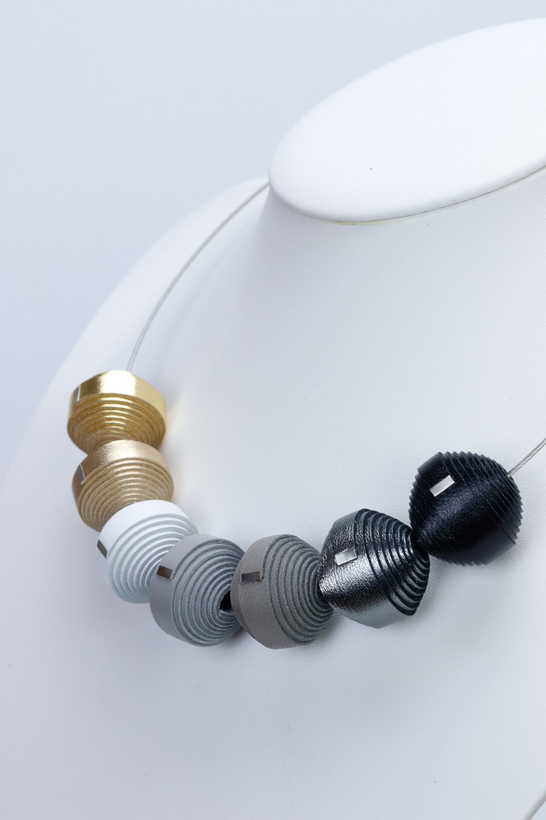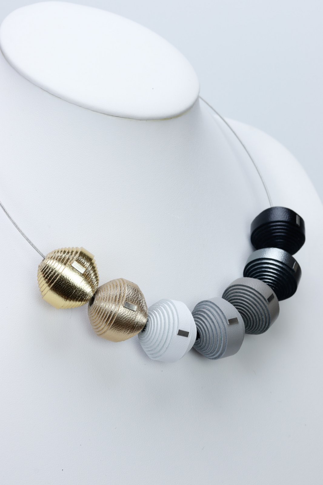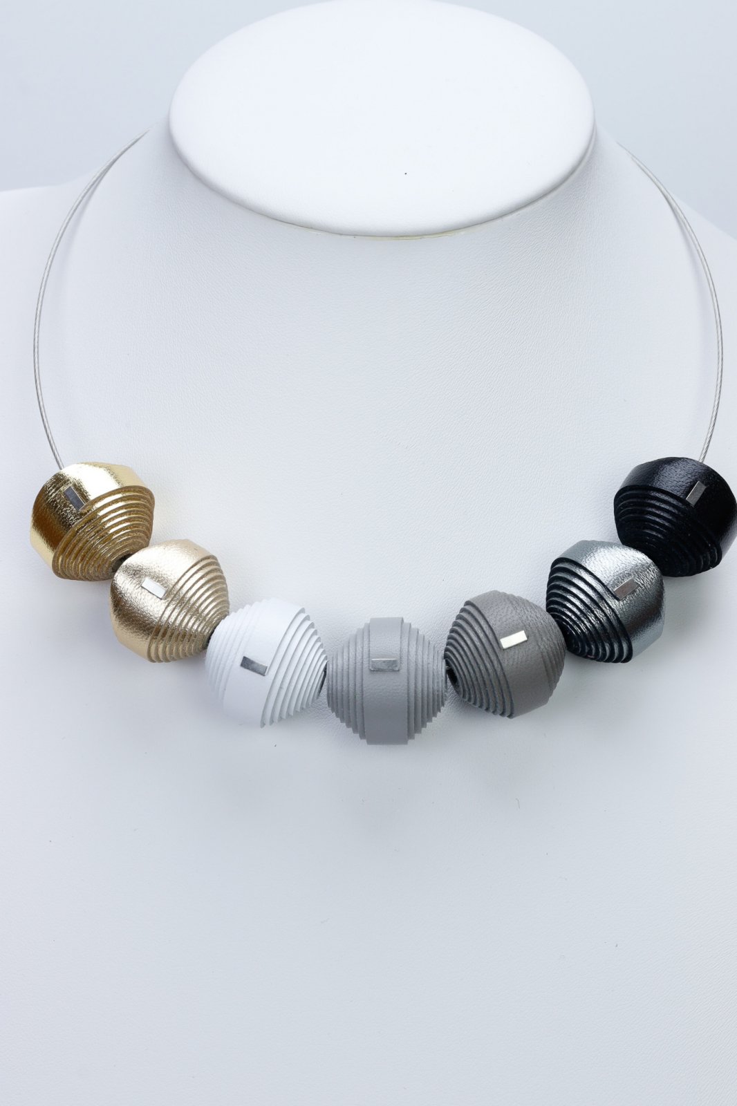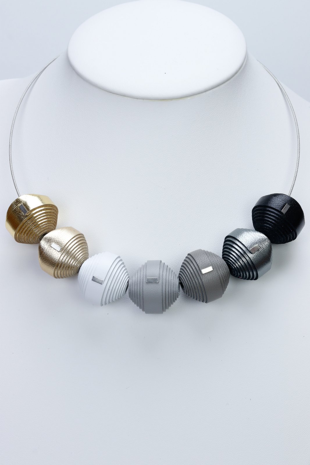 "Baza colierului este realizată din oțel inoxidabil auriu.Colier din piele lucrat manualConcept unic mix-and-match: bila metalică de la capătul bazei din oțel inoxidabil se deșurubează și poți adăuga bonboane de la alt colier, le poți scoate sau amesteca, astfel încât să poți avea un colier nou asortat oricărei ținute.Cutia premium conține 7 mărgele leatherbonbon care pot fi aranjate în combinații de la 3 la 7 mărgele, în funcție de dispoziție și stilul vestimentar.Diametru bază colier: aproximativ 14 cmConținut cutie: