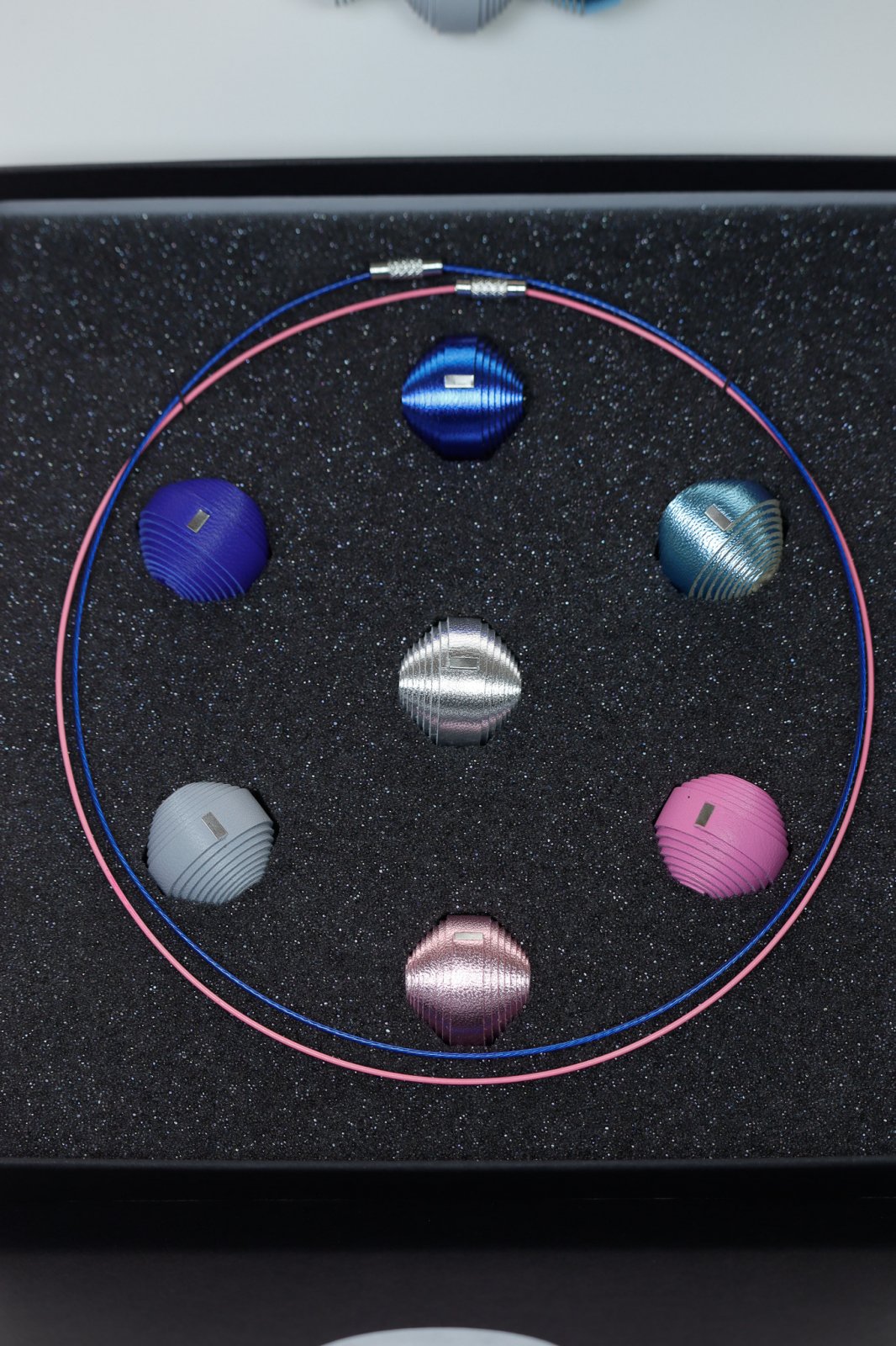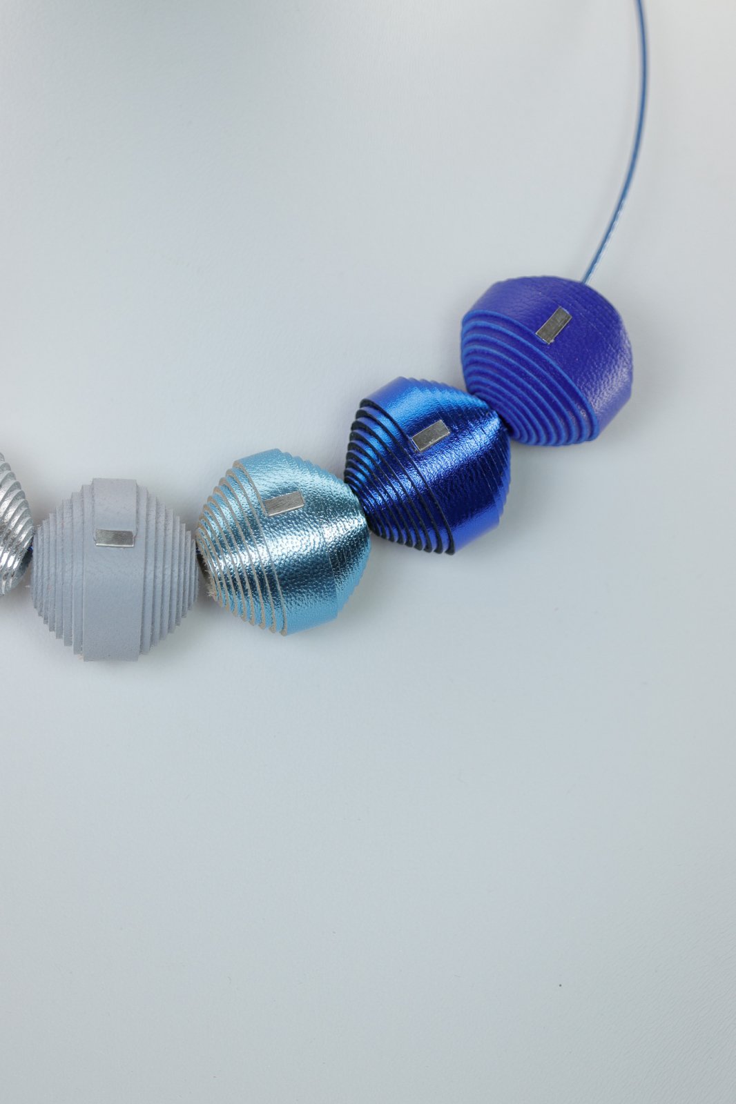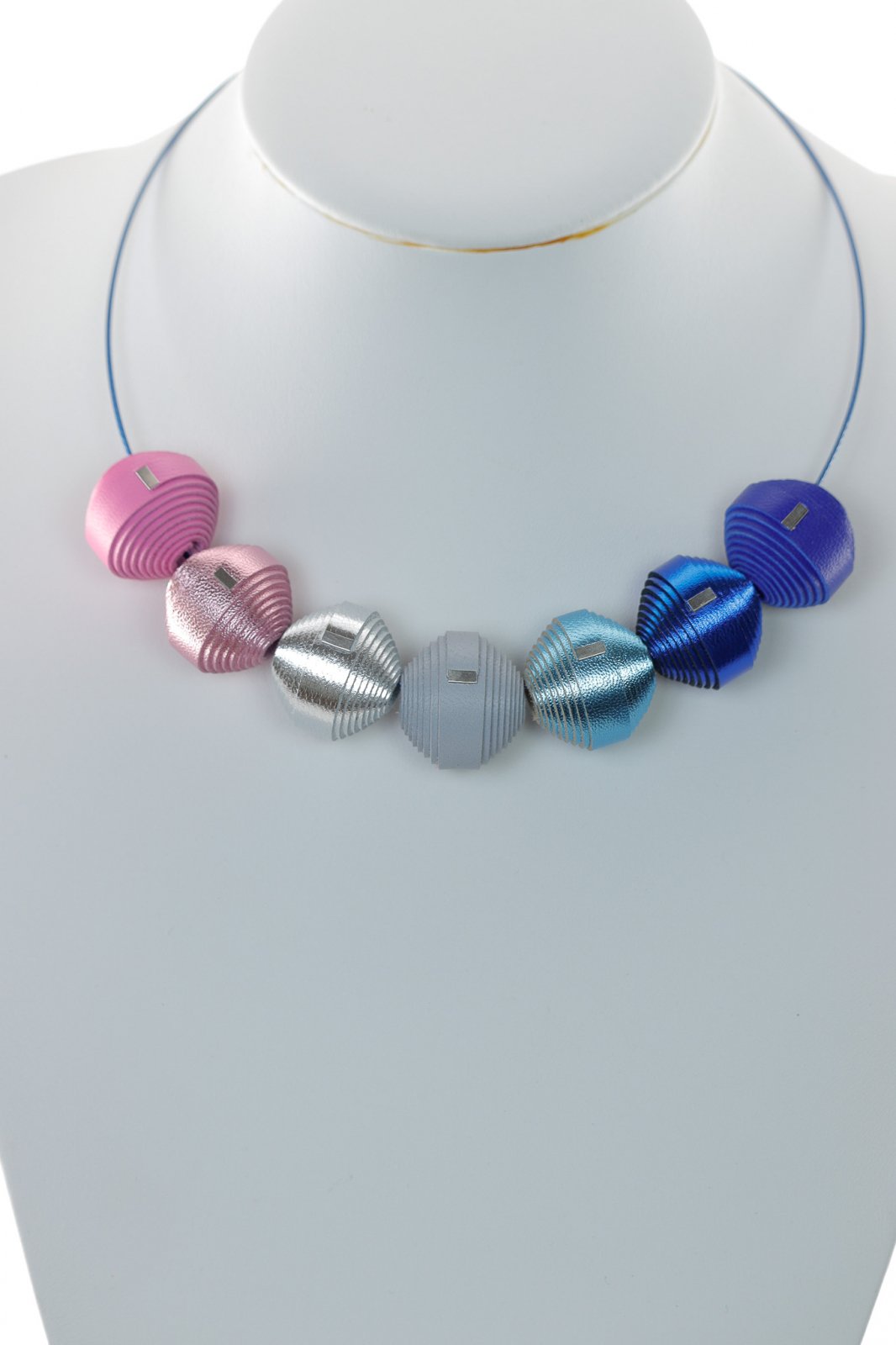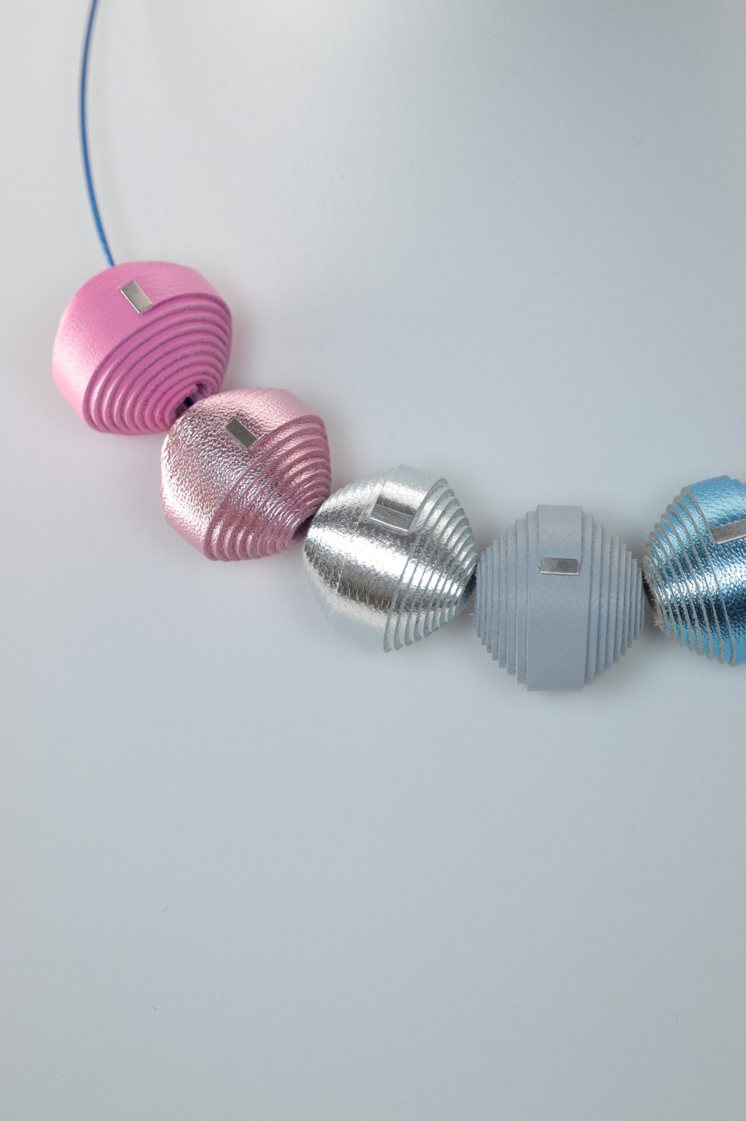 Muză Metalică. Strălucește cu feminitate sofisticată. Acest set personalizabil include 7 mărgele din piele lucrate manual într-o paletă luxoasă de roz metalic, argintiu și albastru, completat cu 2 baze de colier pentru stilizări infinite.