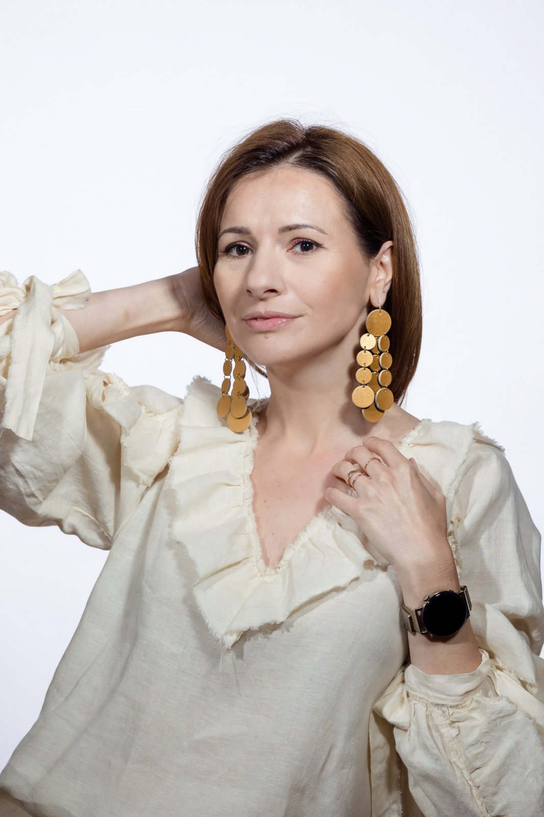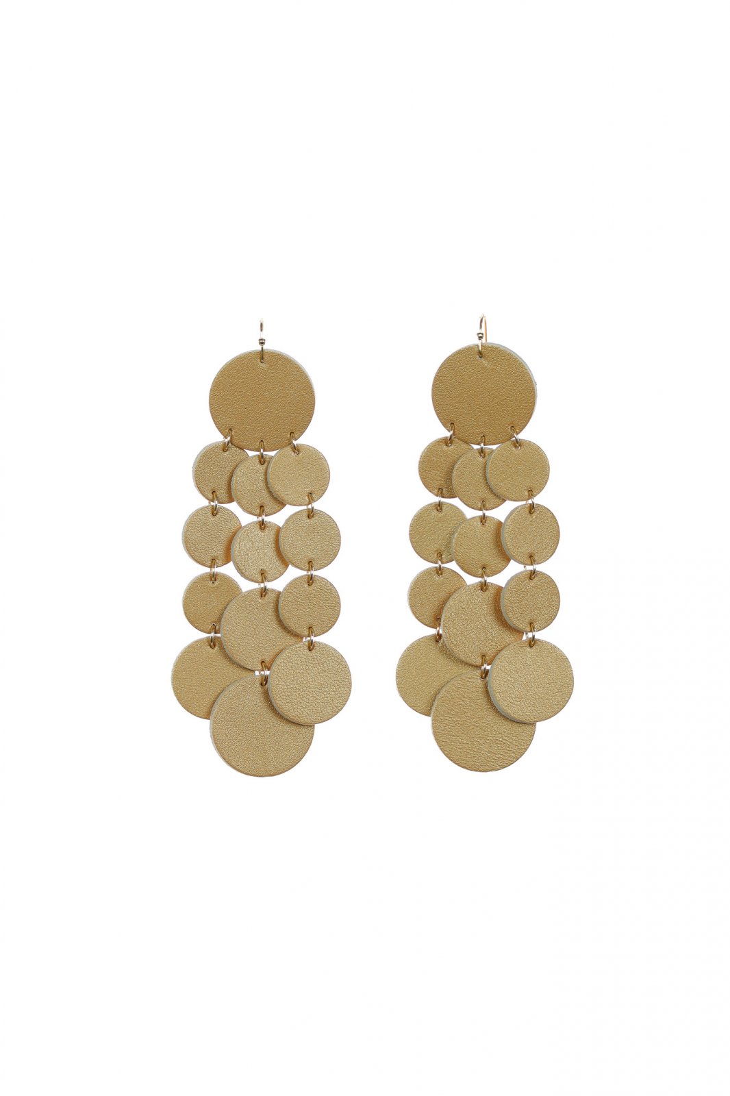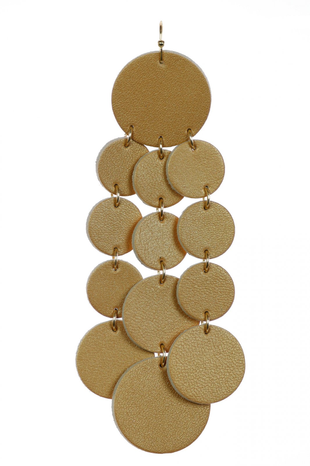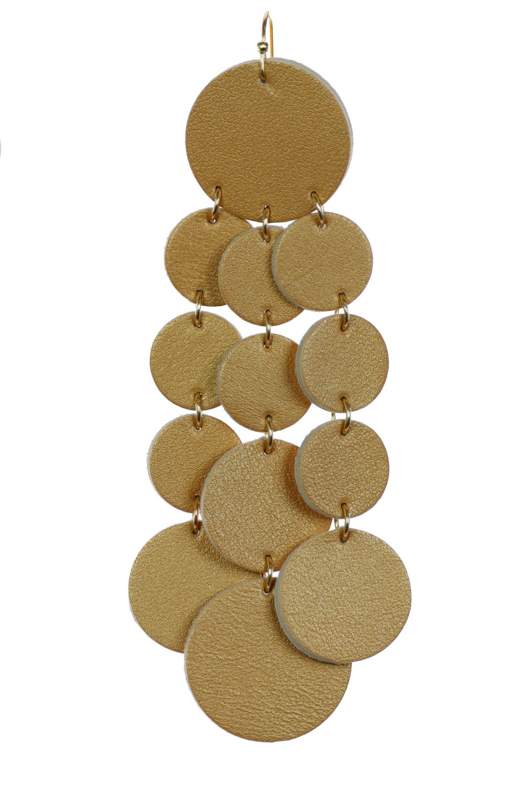 Cascadă aurie. O cascadă luxoasă de 9 cm de cercuri din piele lucrate manual, într-un auriu metalic strălucitor. Acești cercei geometrici dinamici sunt un statement de glamour pur, sofisticat.