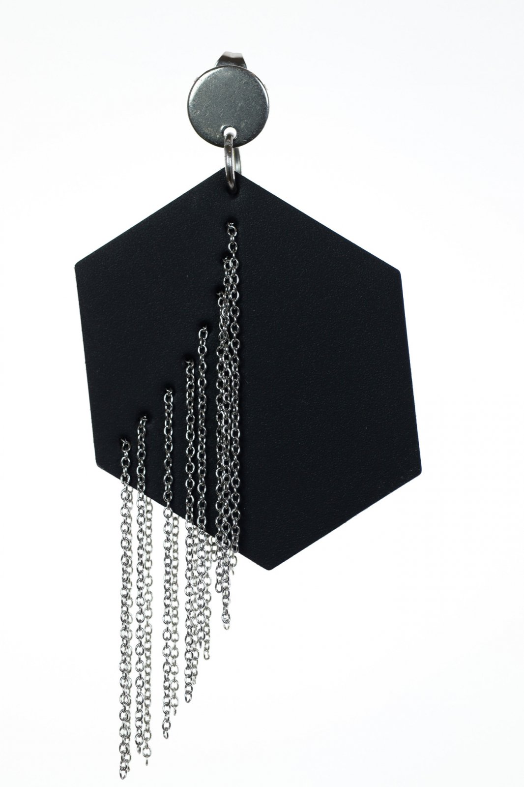 Abordare Geometrică. Un hexagon șic din piele neagră mată este accentuat de o cascadă de lanțuri argintii. Acești cercei lucrați manual oferă un statement îndrăzneț, modern și dramatic de stil geometric.