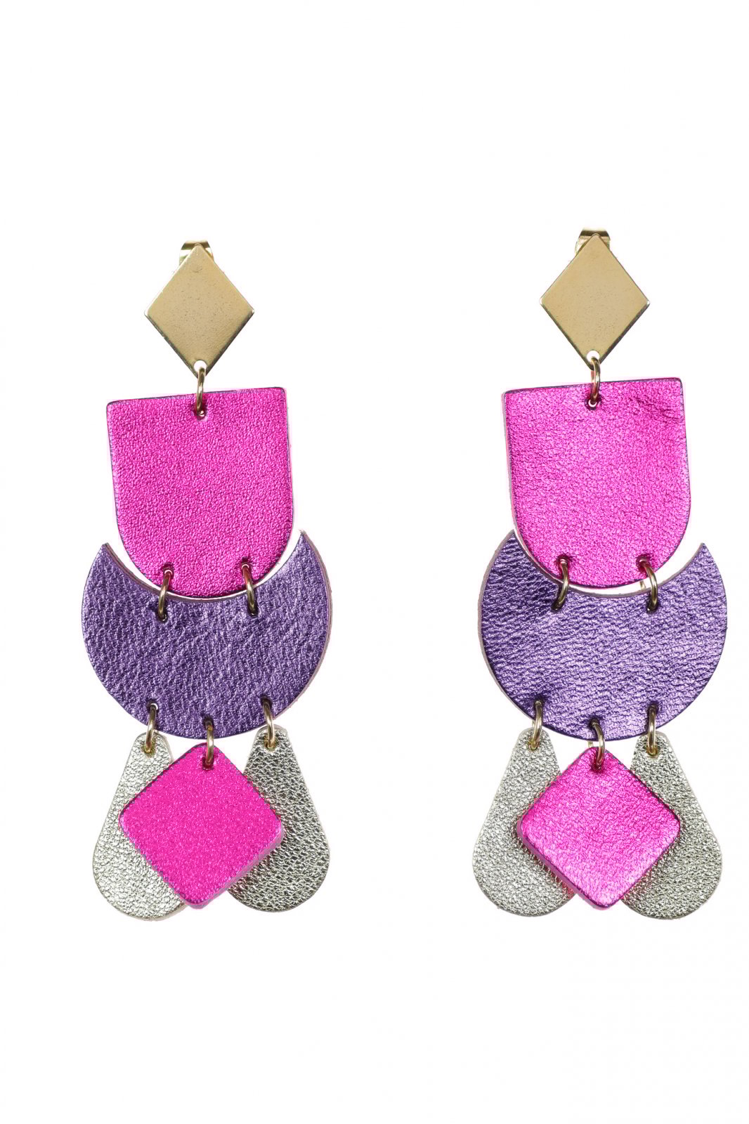 Cercei statement din piele naturală cu un design geometric în nuanțe de auriu, roz fuchsia și violet. Un accesoriu jucăuș care îți aduce o stare de creativitate și bucurie colorată.