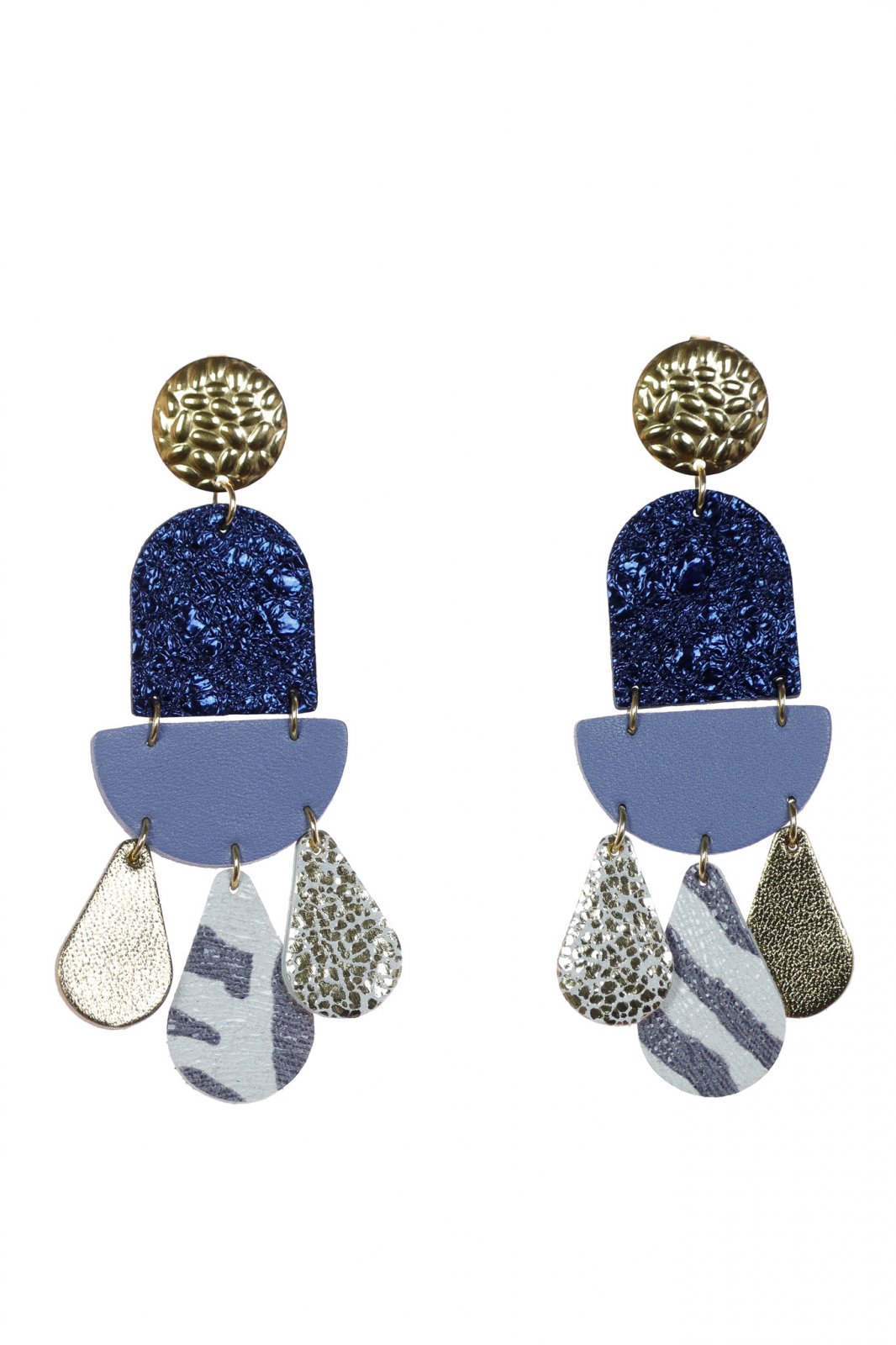 Cascadă artistică. Un cercel uimitor, pe mai multe straturi, de 9 cm, combinând auriu ciocănit, albastru sclipitor și forme din piele mată. Un statement sofisticat și modern de eleganță creativă.