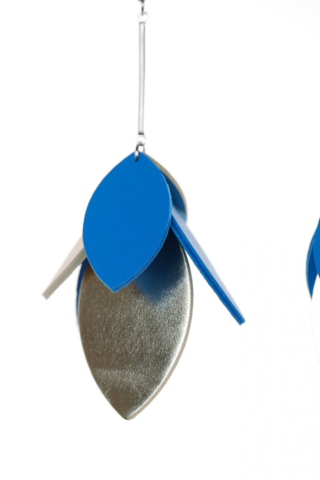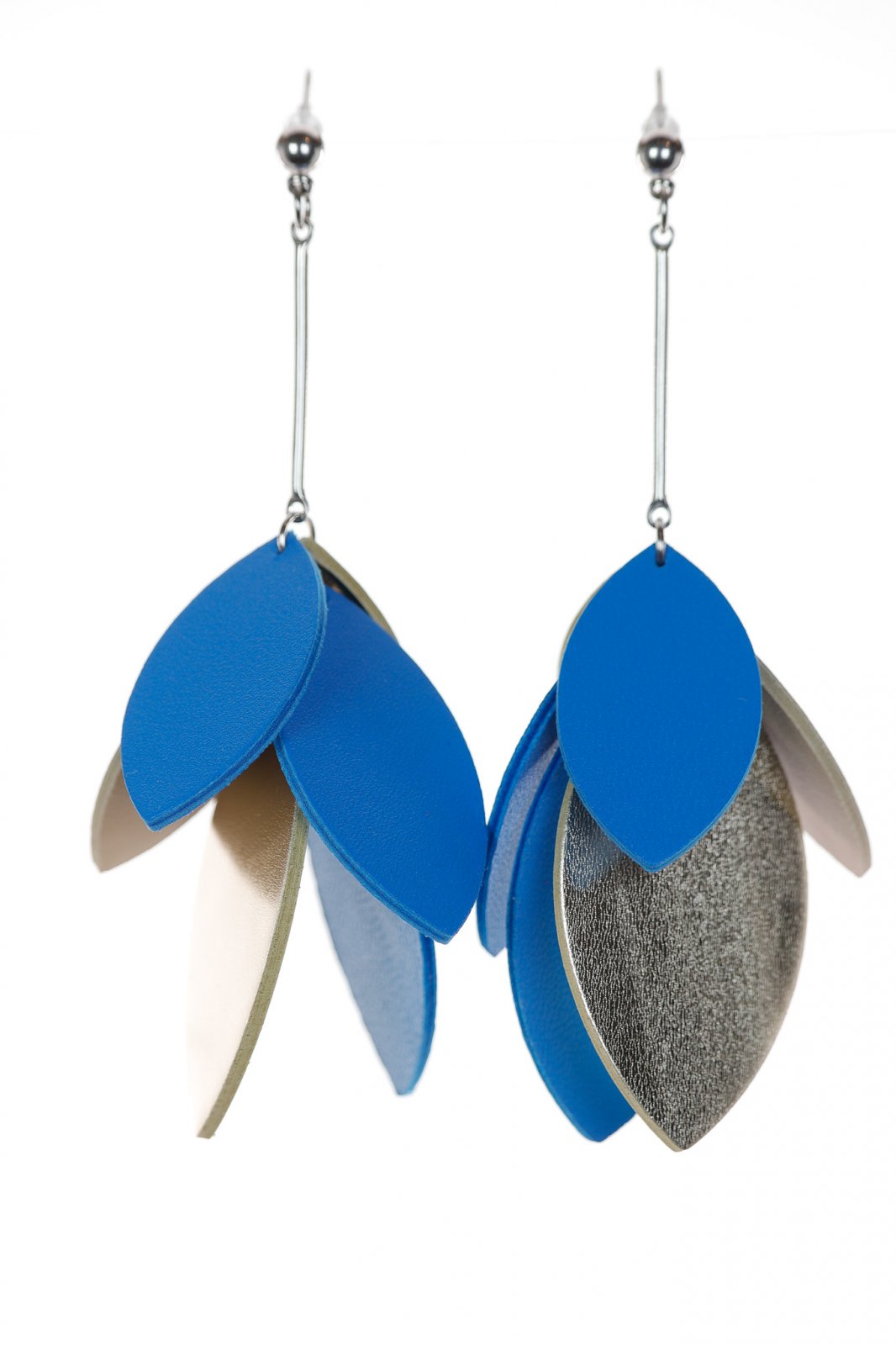 Contrast Modern. O cascadă de petale din piele lucrate manual într-o combinație îndrăzneață de albastru intens și auriu metalic creează un cercel statement stilat de 9 cm pentru un look de eleganță contemporană.