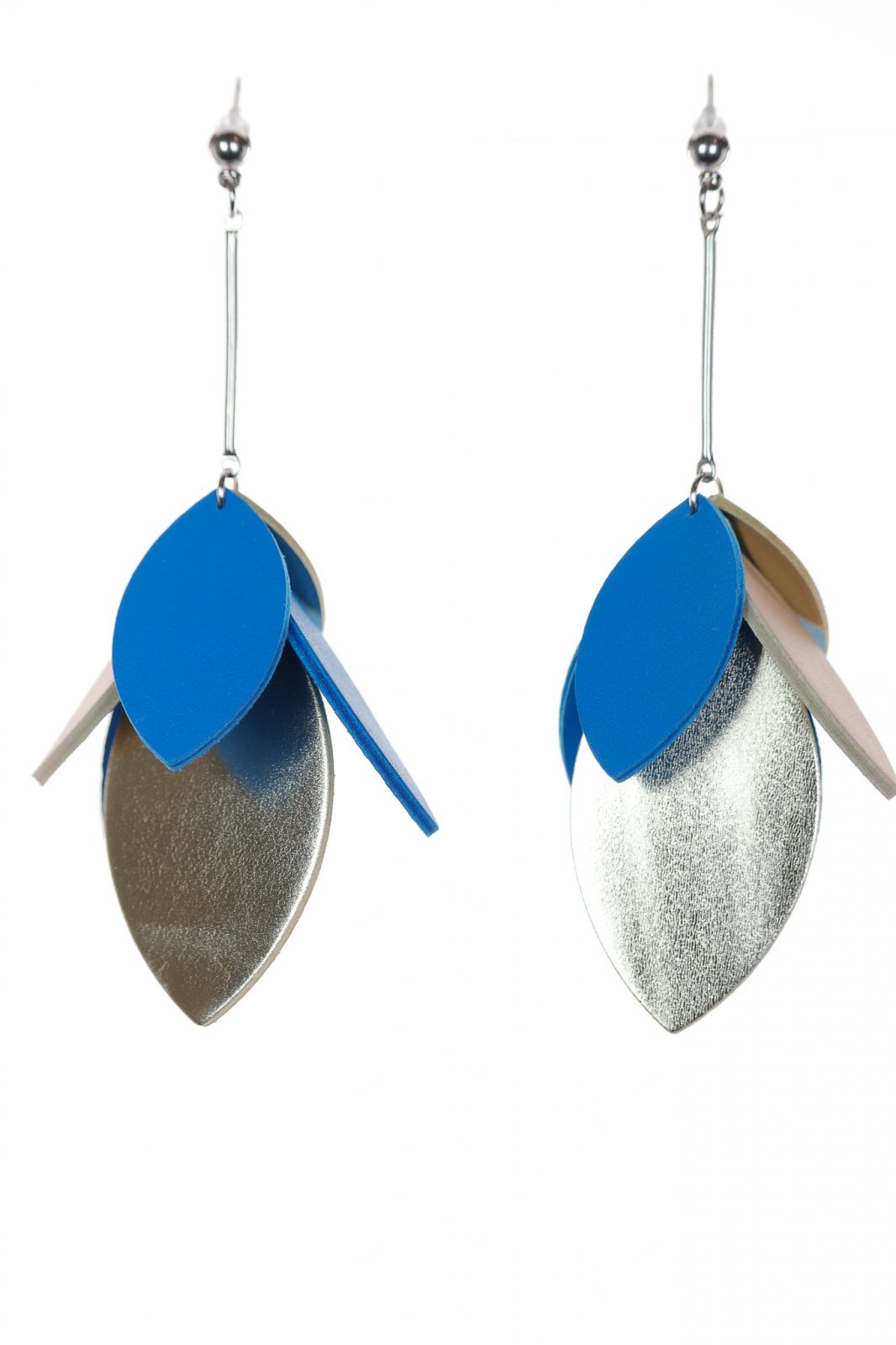 Descriere: Cerceii sunt lucrați manual, fiecare pereche fiind unică, forma florală stilizată aducând o notă modernă unui motiv clasic. Designul inovator suprapune două tipuri de petale: unele colorate într-o nuanță puternică de albastru și altele într-o nuanță auriu metalic, obținând un contrast stilat. Sistemul de închidere este un cârlig subțire din oțel inoxidabil.