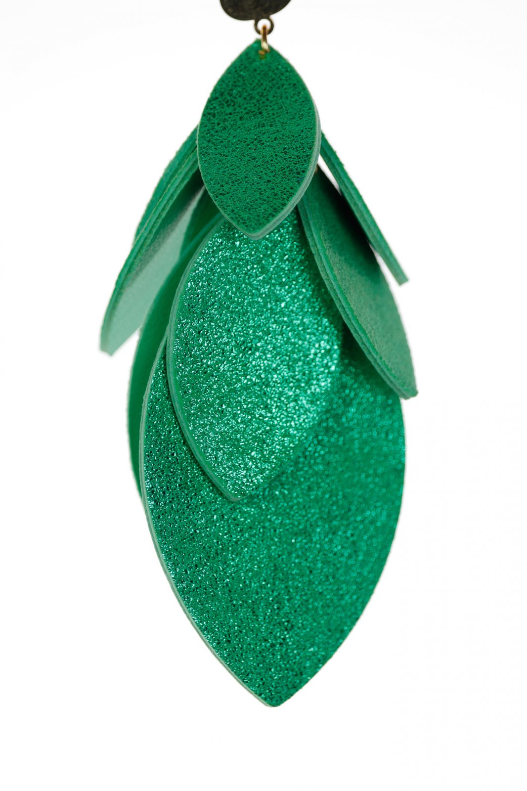 Cascadă Strălucitoare. O cascadă de petale din piele lucrate manual într-un verde vibrant cu o notă de sclipici. Acești cercei de 8 cm sunt o piesă statement modernă și elegantă pentru orice ocazie.