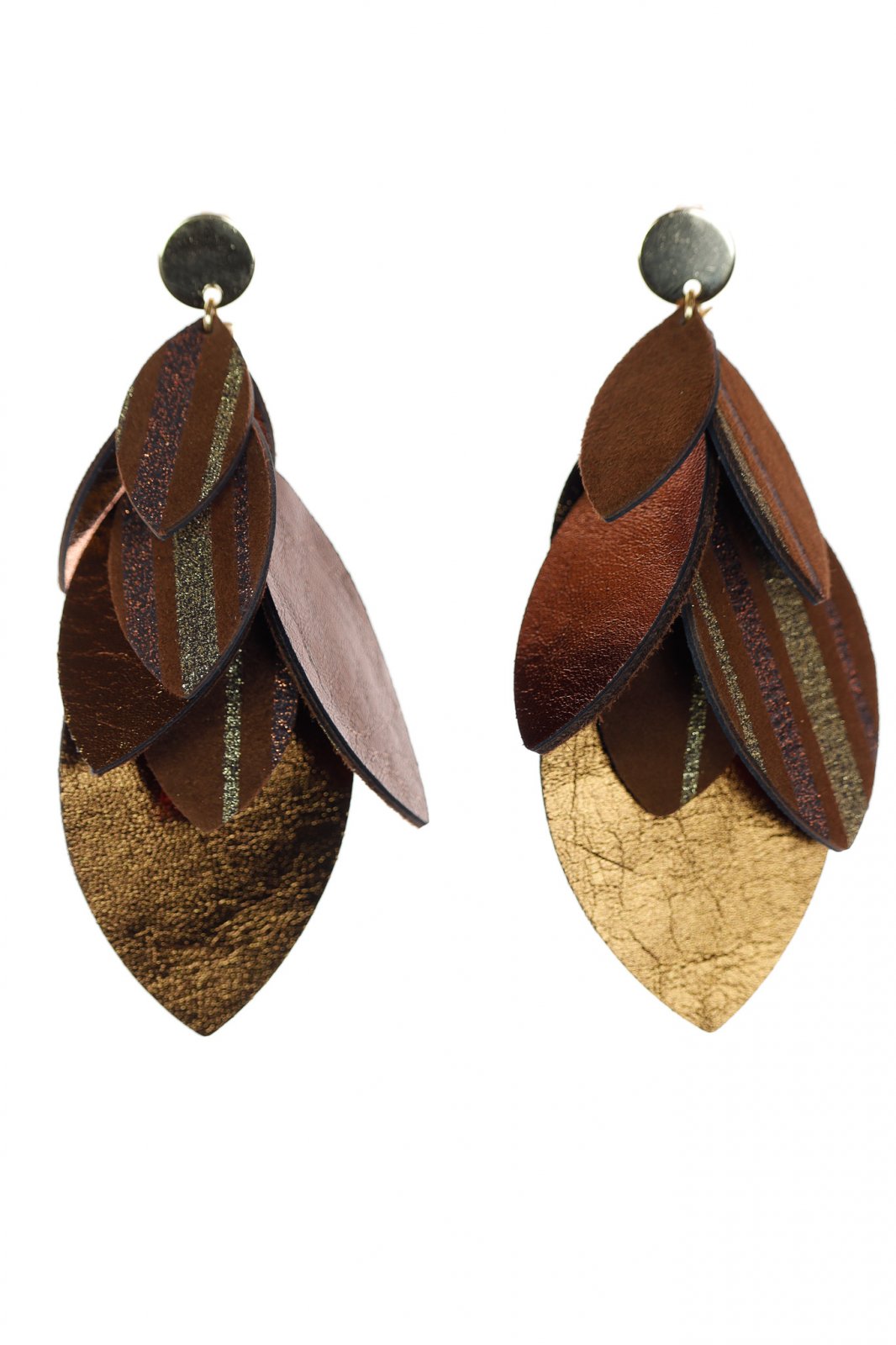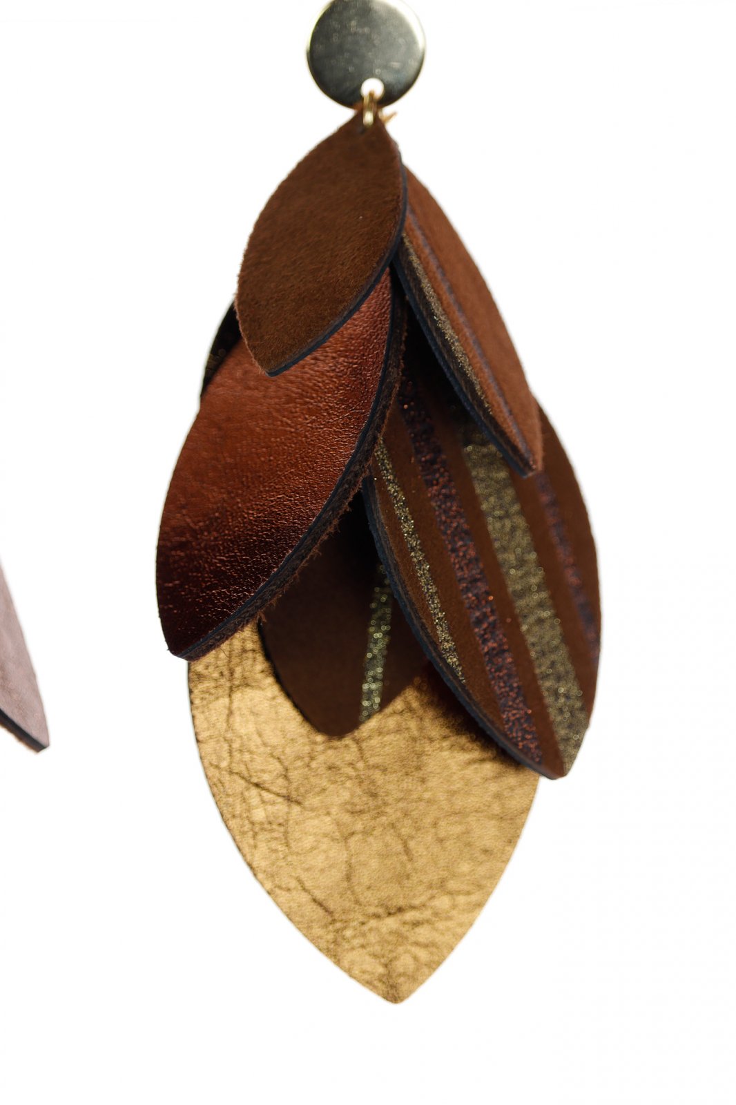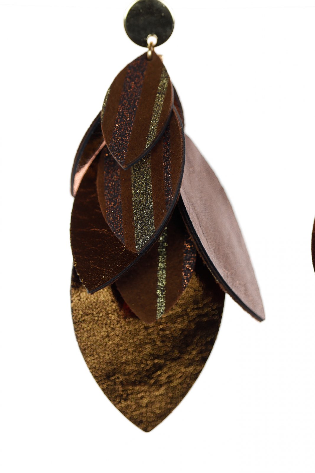 Glamour Pământiu. O cascadă bogată de petale din piele lucrate manual în tonuri pământii de maro și auriu strălucitor. Acești cercei statement de 8 cm sunt un accesoriu versatil și expresiv pentru un look sofisticat.