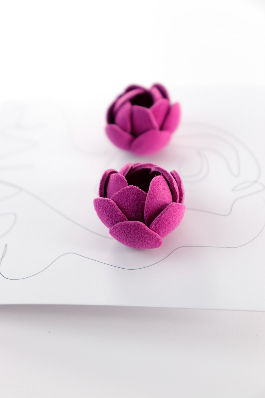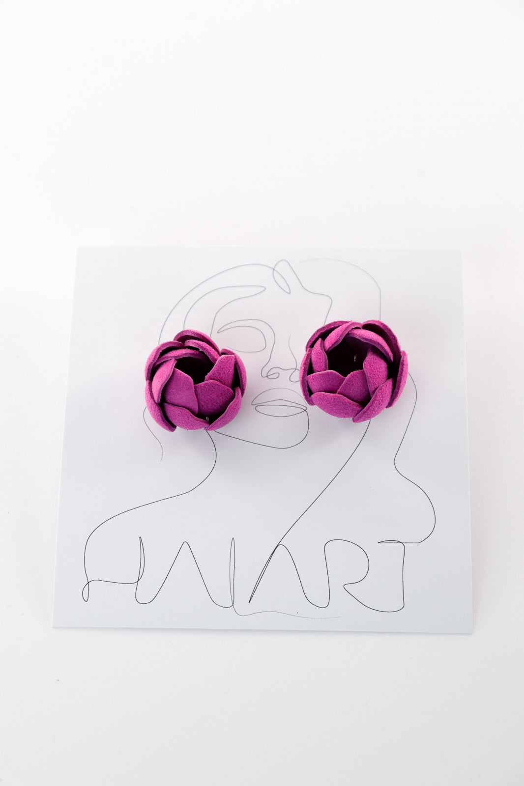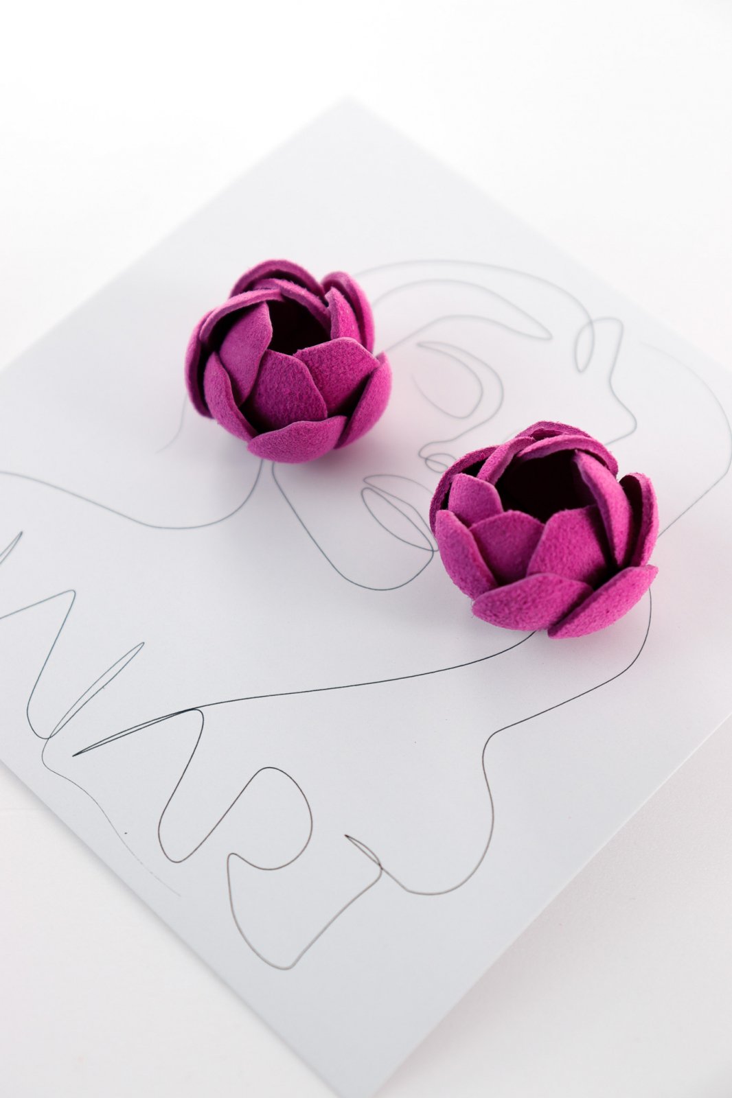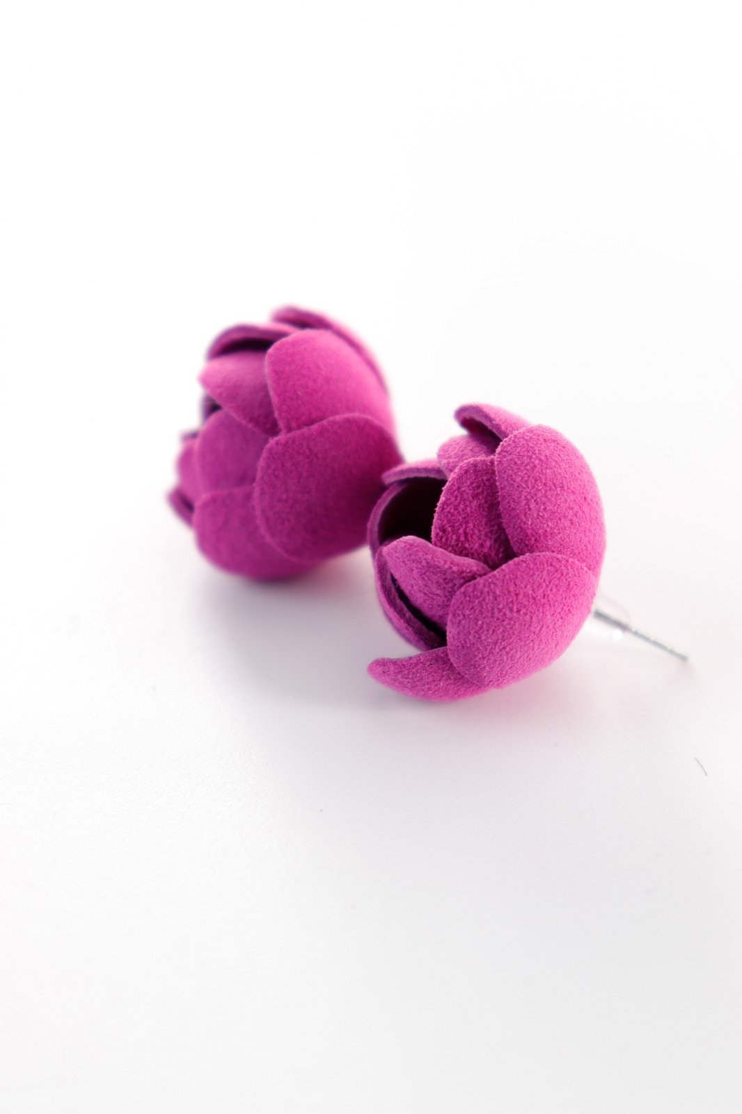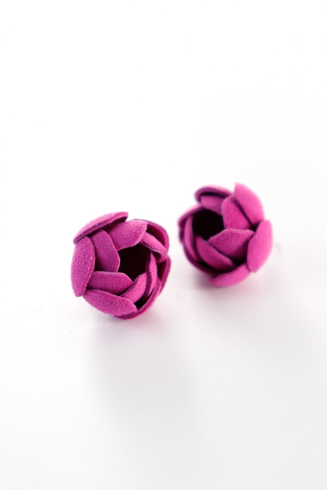 Descriere: Acești cercei, cu un diametru de 2 cm, sunt lucrați manual cu atenție la detalii. Forma florală stilizată amintește de un trandafir compact și modern. Petalele din piele naturală adaugă volum și interes vizual, iar culoarea puternică și feminină mov le conferă un plus de energie.