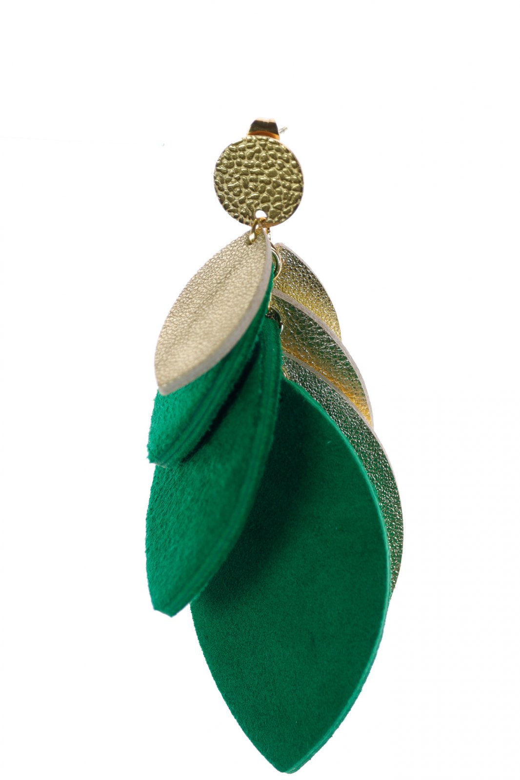 Eleganță Proaspătă. O cascadă modernă de 8 cm de petale din piele lucrate manual în verde smarald vibrant și auriu strălucitor, perfectă pentru a adăuga un pop sofisticat de culoare și strălucire look-ului tău.