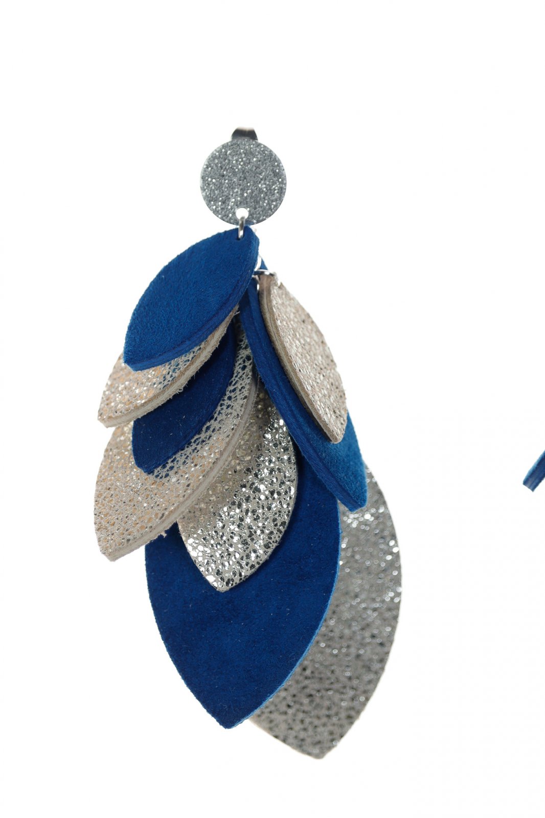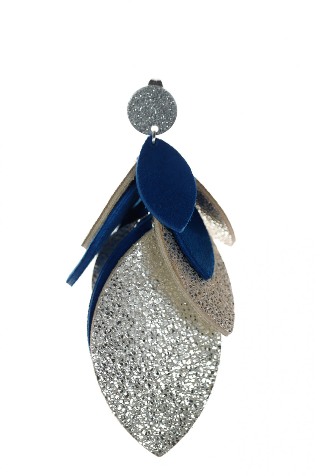 Sofisticare Rece. O cascadă captivantă de 8 cm de petale din piele lucrate manual într-un design modern, combinând albastrul regal intens cu strălucirea texturată a argintiului pentru un statement rafinat.