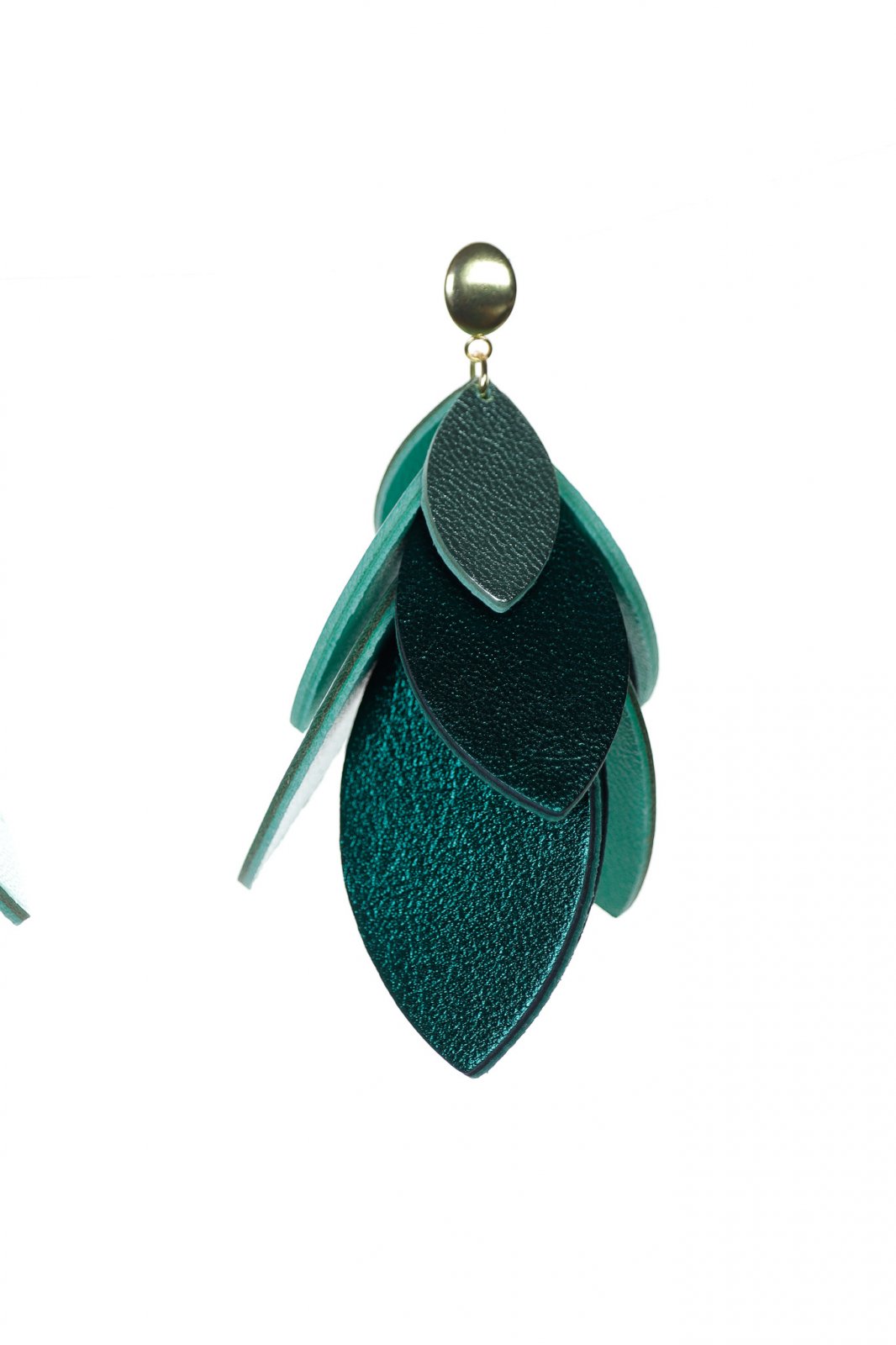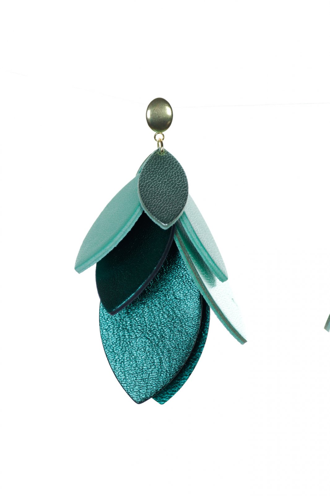 Opulent & Strălucitor. O cascadă sofisticată de petale din piele lucrate manual într-un gradient frumos de verde sidefat, de la mentă la smarald. Un cercel statement versatil și modern de 7 cm.