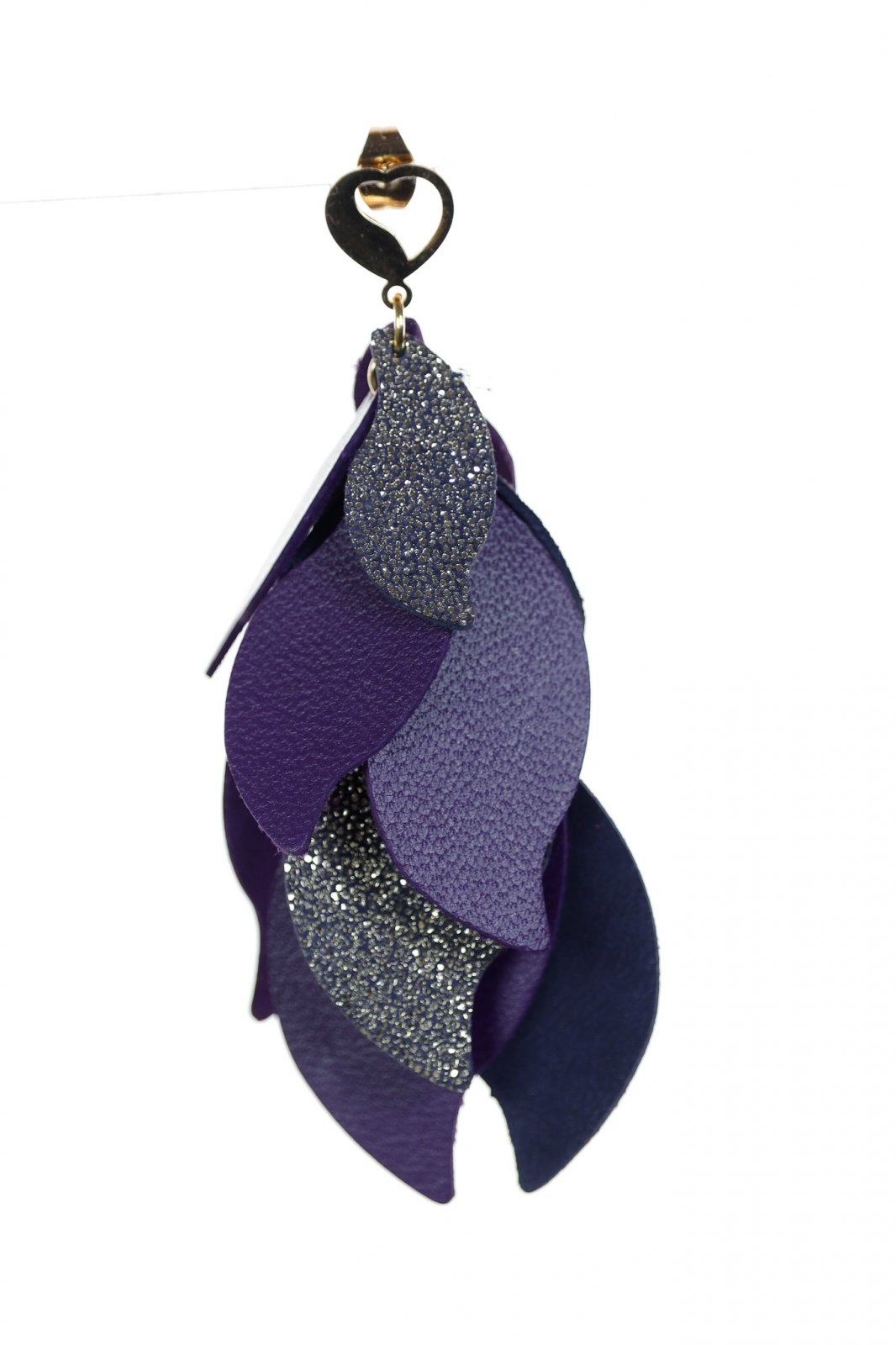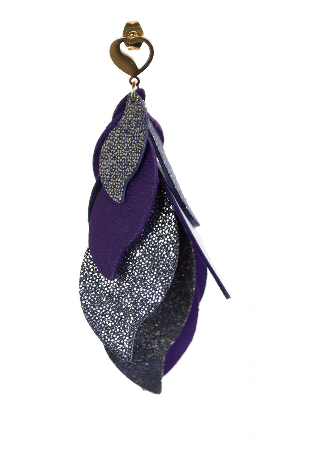 Cascadă Romantică. O cascadă sofisticată de 8 cm de petale din piele lucrate manual în nuanțe de violet și argintiu, finisată cu un detaliu delicat în formă de inimă pentru o notă de romantism modern.