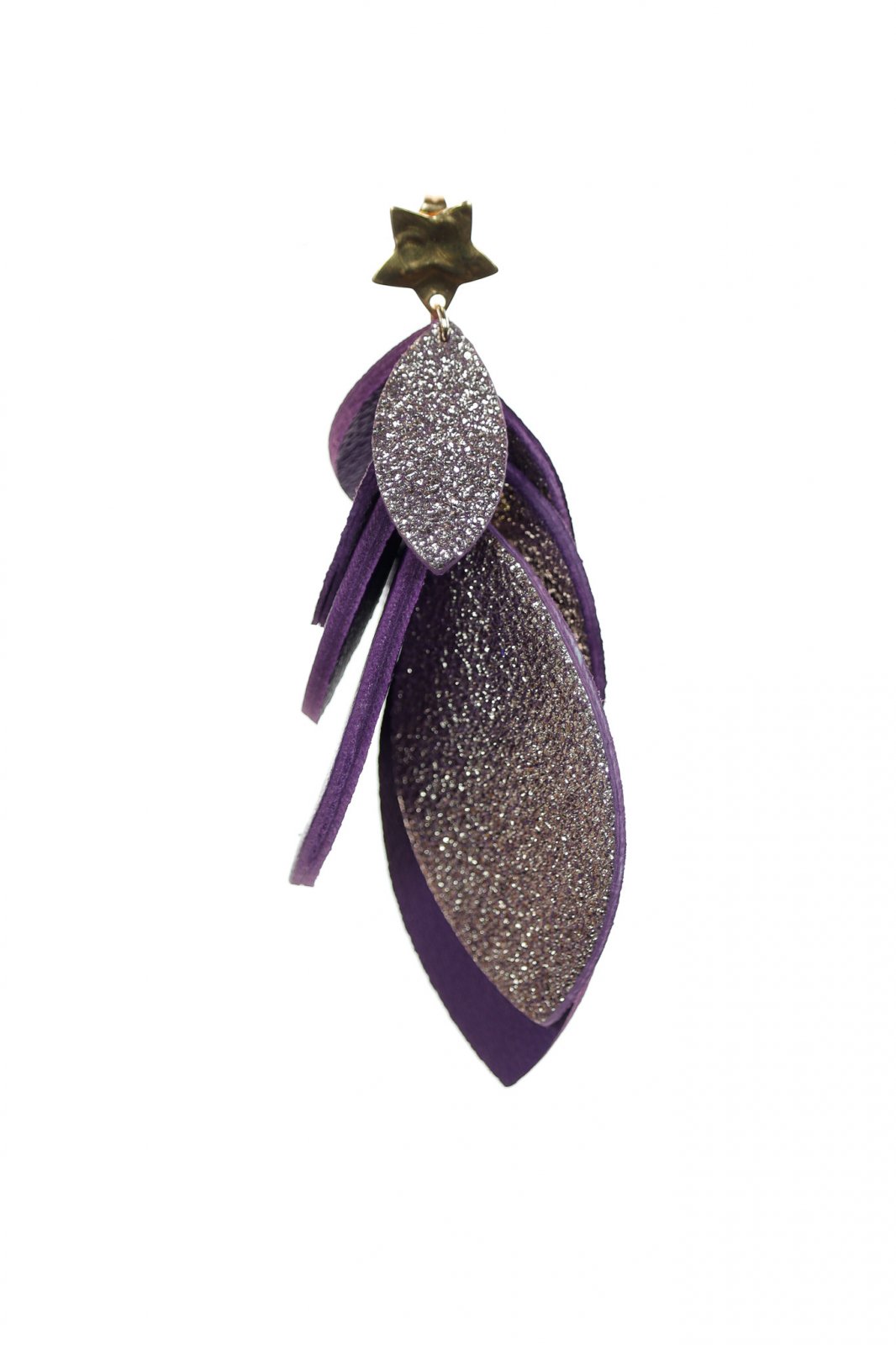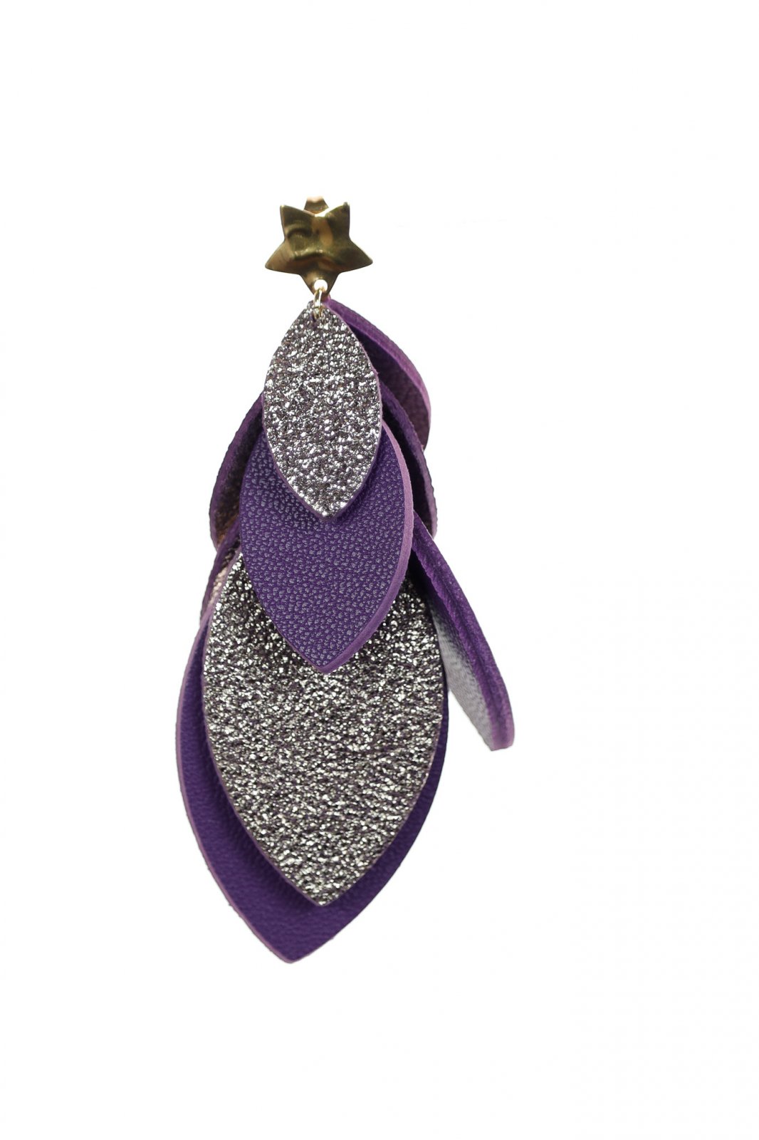 O Atingere de Magie. O cascadă sofisticată de 8 cm de petale din piele lucrate manual în violet și argintiu metalic, finisată cu o steluță aurie delicată pentru un statement cu adevărat feeric.