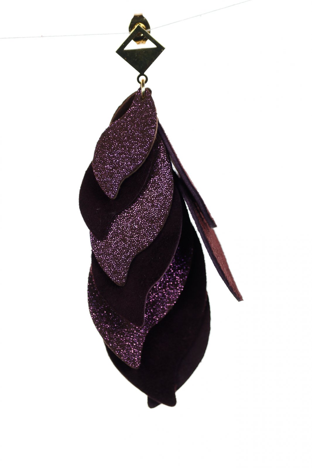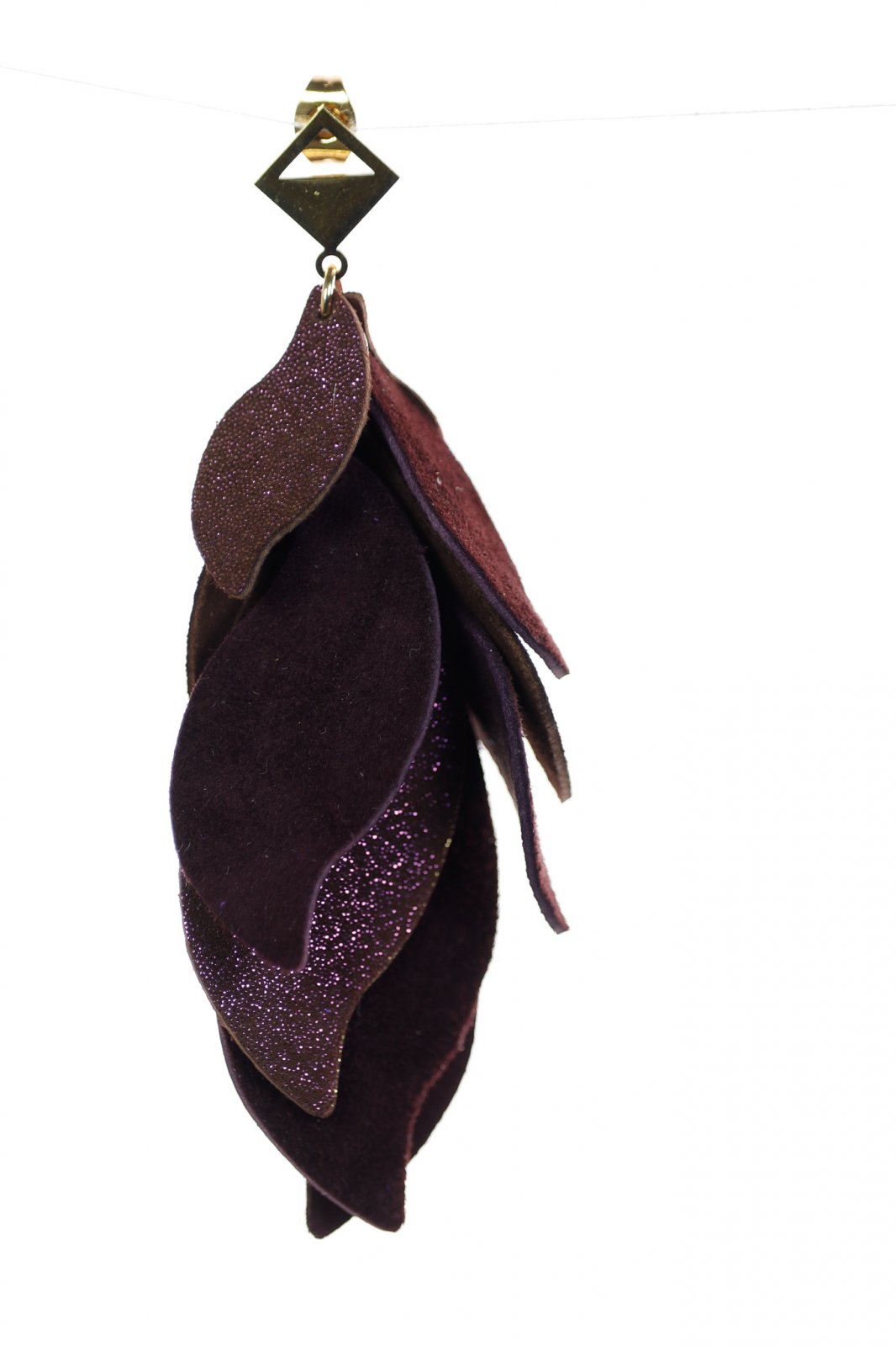 Glamour Misterios. O cascadă sofisticată de 8 cm de petale din piele lucrate manual în maro bogat cu o notă de sclipici violet, accentuată cu un detaliu geometric auriu modern pentru un look dramatic și rafinat.