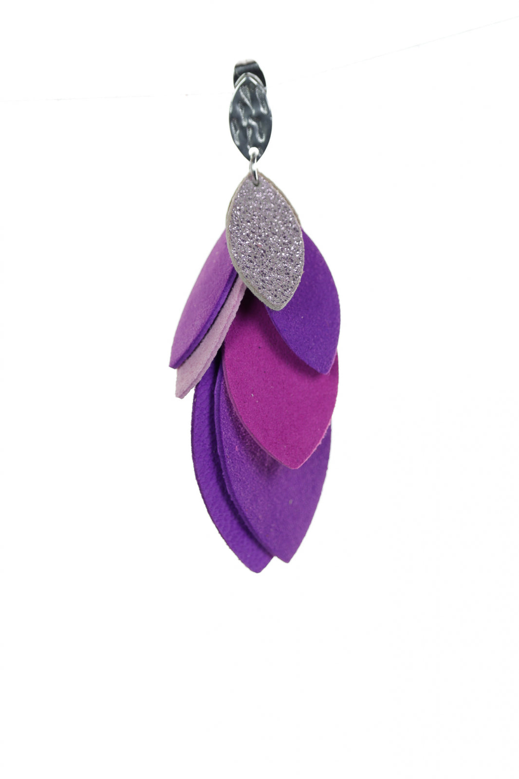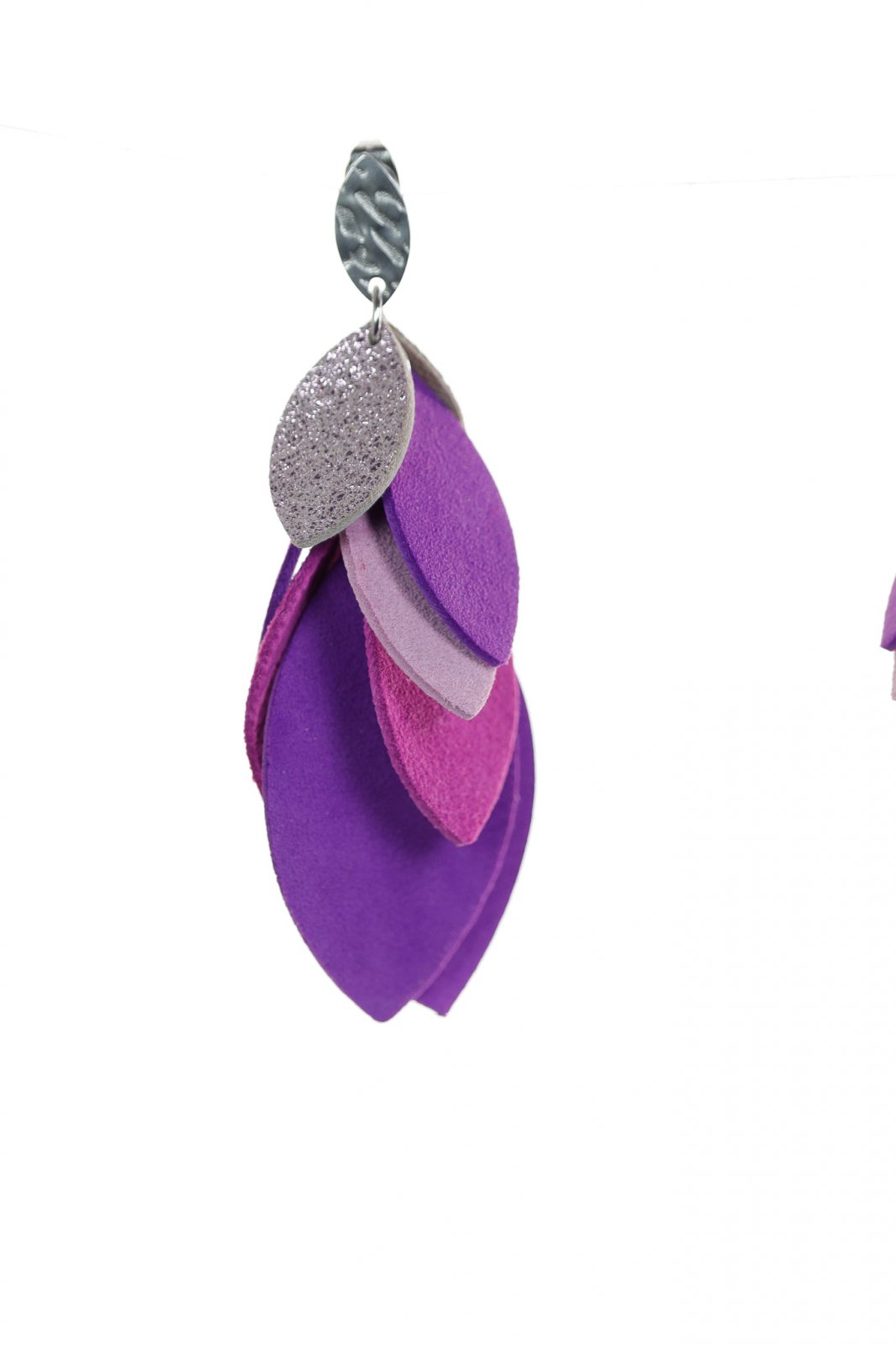 Romantic & Feminin. O cascadă grațioasă de 8 cm de petale din piele lucrate manual într-un amestec frumos de violet și roz, accentuată cu argintiu texturat pentru o notă de eleganță contemporană.