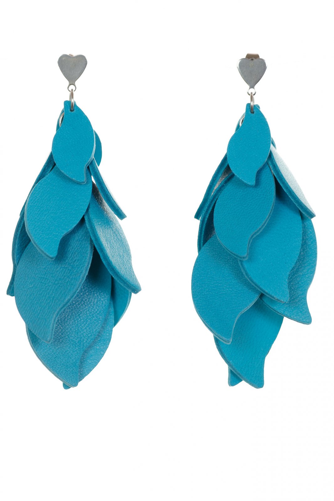 Cercei statement din piele naturală cu un design organic inspirat de petale în turcoaz vibrant. Un accesoriu elegant care aduce prospețime și feminitate oricărei ținute.