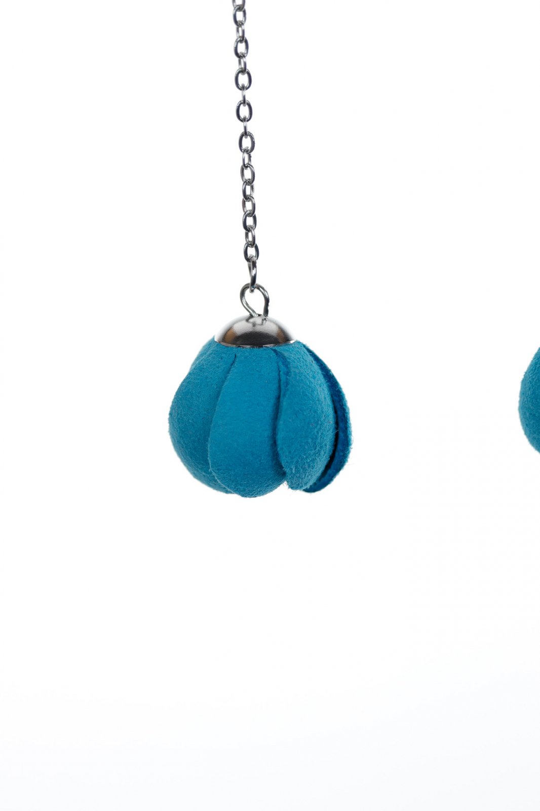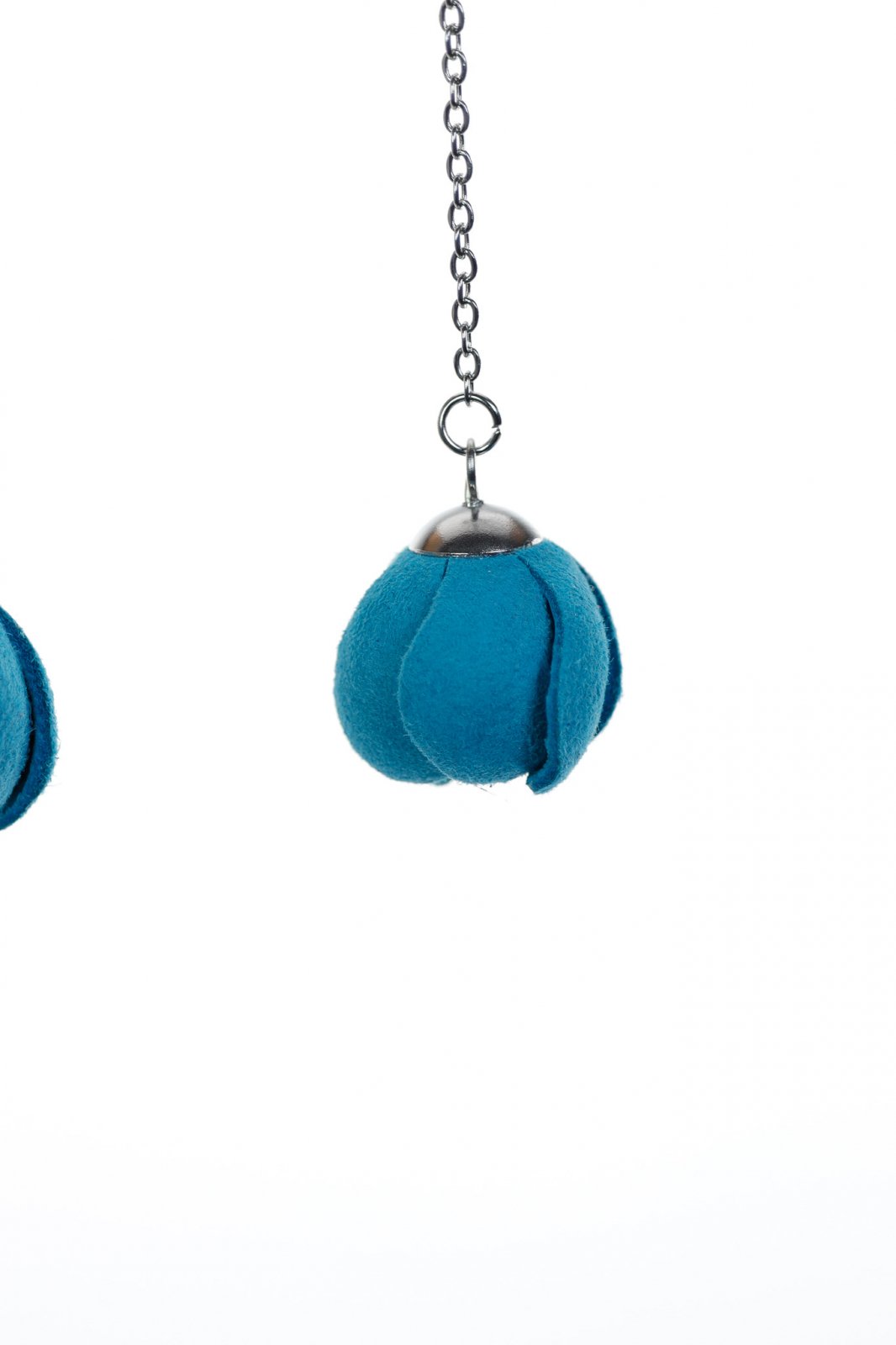 Eleganță delicată în mișcare. Un trandafir în miniatură fermecător, lucrat manual din piele, în turcoaz vibrant, atârnă grațios de un lanț fin, creând un cercel modern și romantic de 7 cm.