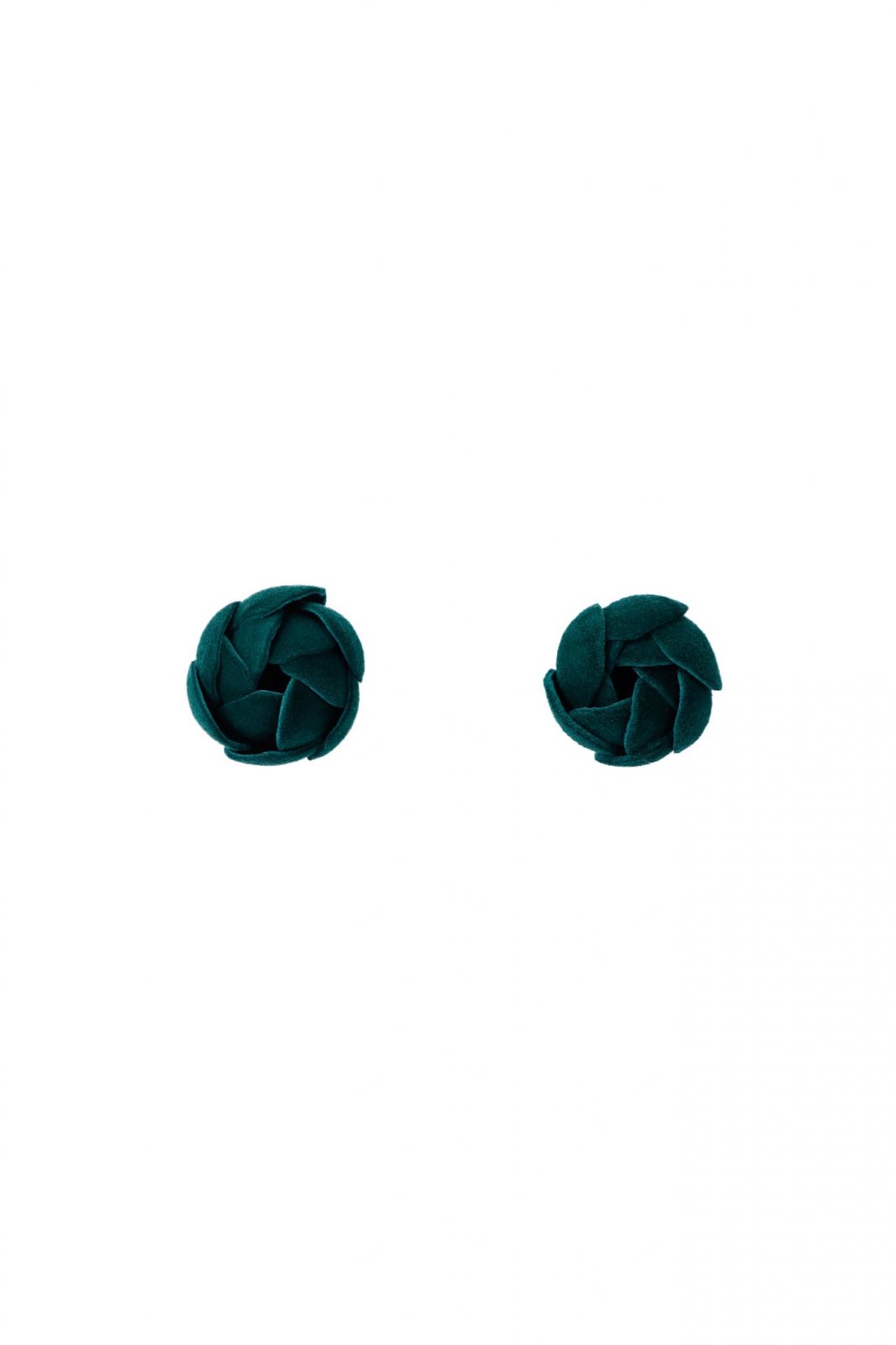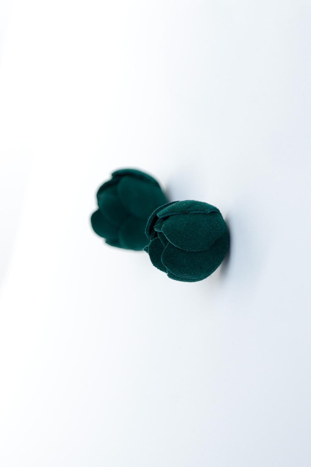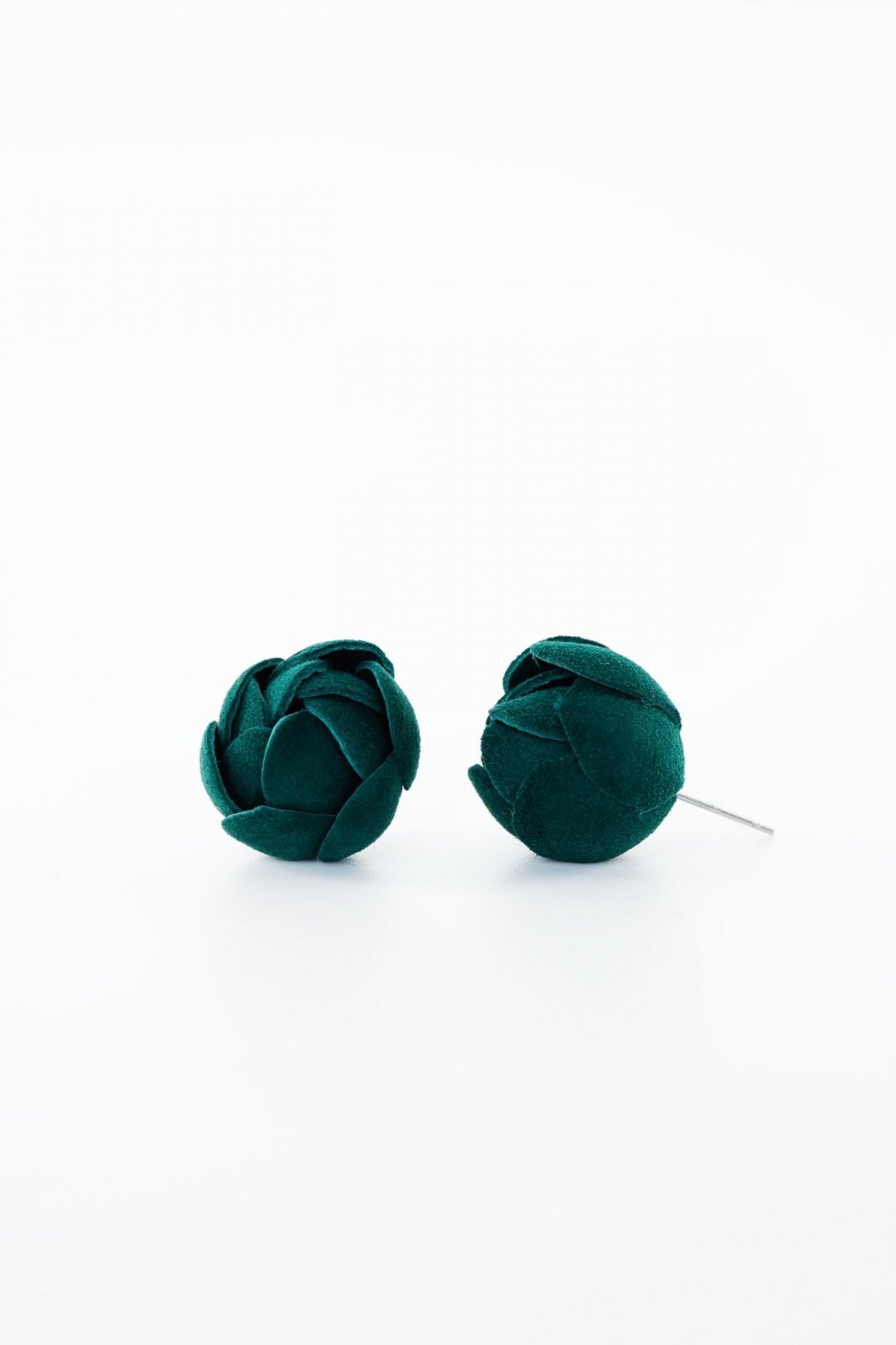 Eleganță profundă. Un trandafir 3D frumos sculptat din piele, într-un verde închis sofisticat. Acești cercei stud de 2 cm lucrați manual sunt o expresie atemporală a stilului romantic.