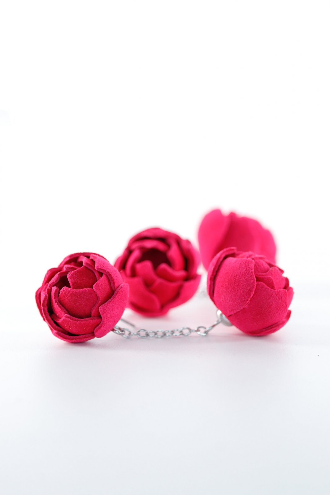 Înfloriri jucăușe. O cascadă de doi trandafiri din piele lucrați manual într-un roz vibrant, conectați printr-un lanț delicat. Un statement unic și dinamic de romantism modern, plin de bucurie.