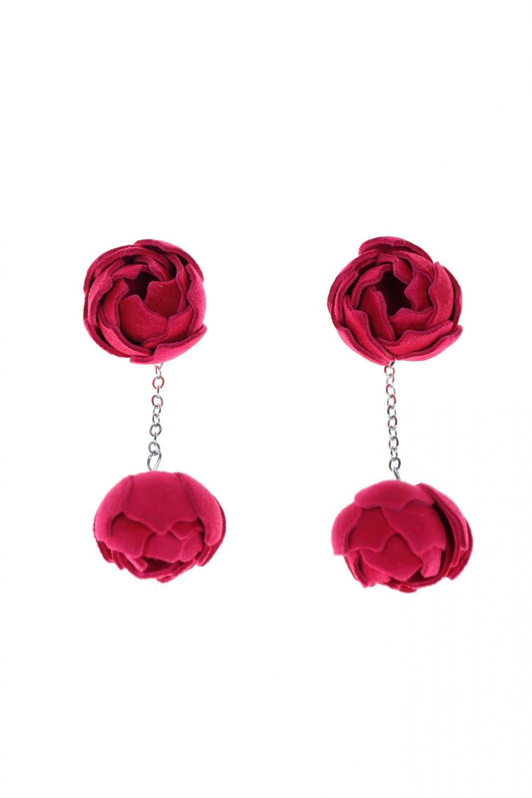 Cercei din piele naturală cu un design floral de trandafir dublu și un lanț metalic. Un accesoriu romantic care îți aduce o stare de feminitate vibrantă și eleganță jucăușă.